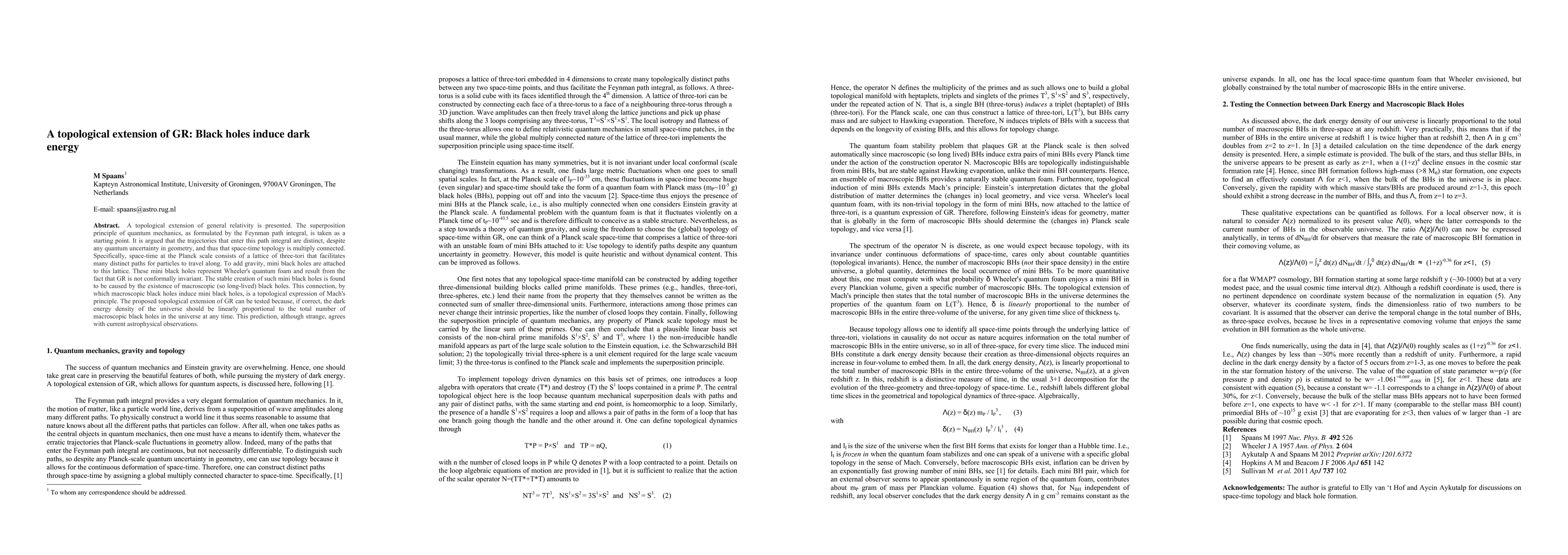 A topological extension of general relativity is presented. The superposition principle of quantum mechanics, as formulated by the Feynman path integral, is taken as a starting point. It is argued that the trajectories that enter this path integral are distinct, despite any quantum uncertainty in geometry, and thus that space-time topology is multiply connected. Specifically, space-time at the Planck scale consists of a lattice of three-tori that facilitates many distinct paths for particles to travel along. To add gravity, mini black holes are attached to this lattice. These mini black holes represent Wheeler's quantum foam and result from the fact that GR is not conformally invariant. The stable creation of such mini black holes is found to be caused by the existence of macroscopic (so long-lived) black holes. This connection, by which macroscopic black holes induce mini black holes, is a topological expression of Mach's principle. The proposed topological extension of GR can be tested because, if correct, the dark energy density of the universe should be linearly proportional to the total number of macroscopic black holes in the universe at any time. This prediction, although strange, agrees with current astrophysical observations.