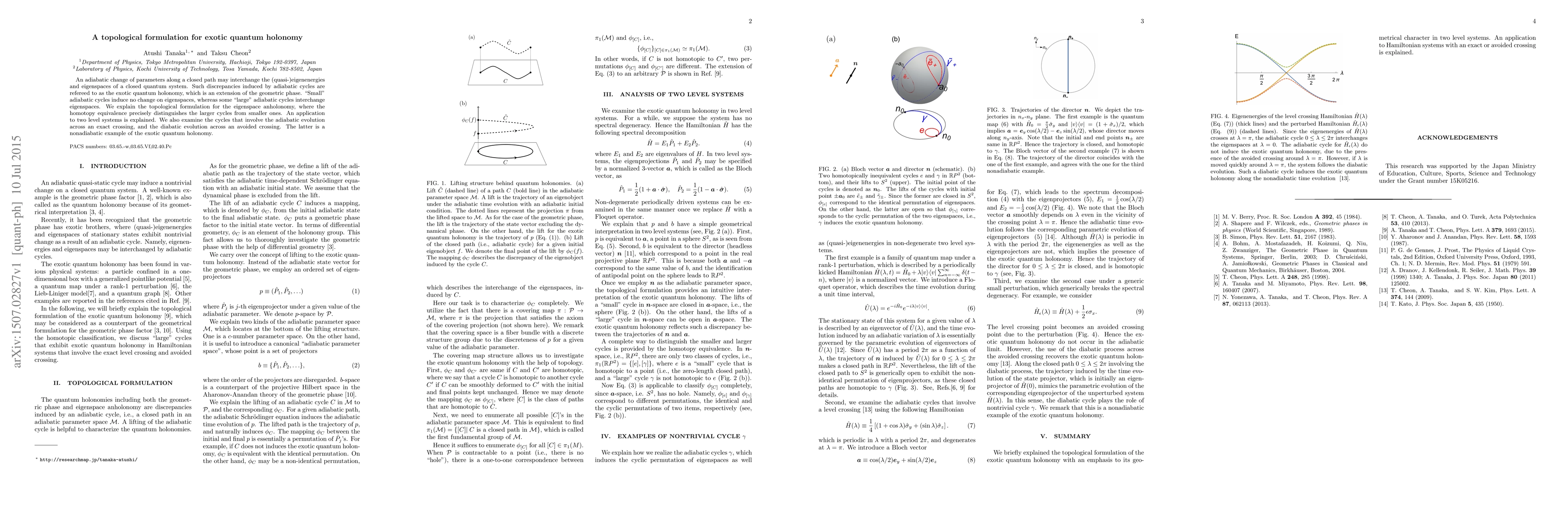 An adiabatic change of parameters along a closed path may interchange the (quasi-)eigenenergies and eigenspaces of a closed quantum system. Such discrepancies induced by adiabatic cycles are refereed to as the exotic quantum holonomy, which is an extension of the geometric phase. "Small" adiabatic cycles induce no change on eigenspaces, whereas some "large" adiabatic cycles interchange eigenspaces. We explain the topological formulation for the eigenspace anholonomy, where the homotopy equivalence precisely distinguishes the larger cycles from smaller ones. An application to two level systems is explained. We also examine the cycles that involve the adiabatic evolution across an exact crossing, and the diabatic evolution across an avoided crossing. The latter is a nonadiabatic example of the exotic quantum holonomy.