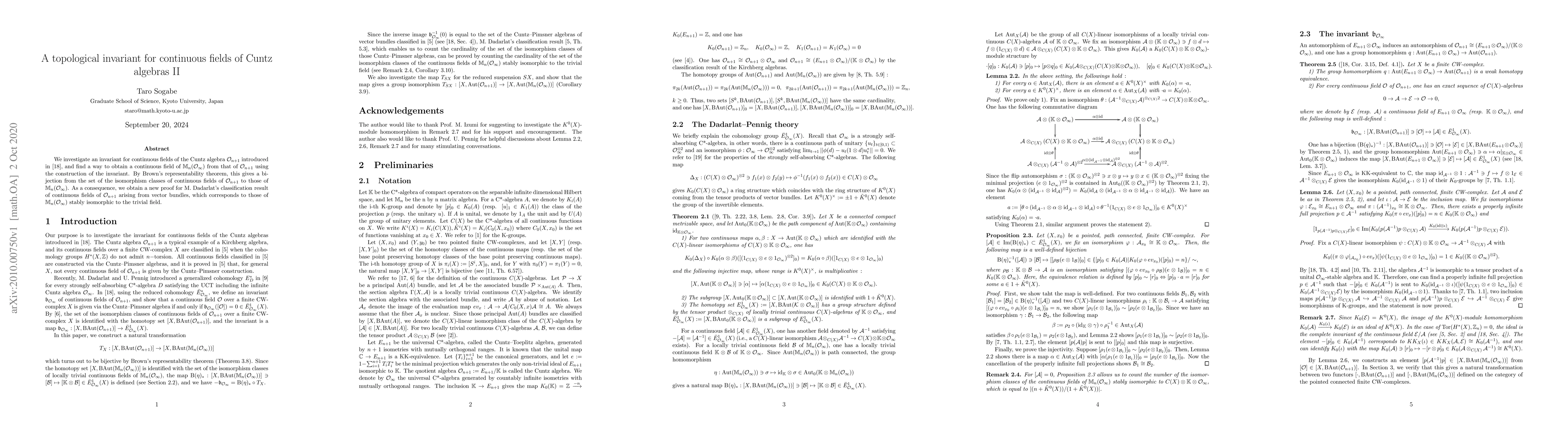 We investigate an invariant for continuous fields of the Cuntz algebra $\mathcal{O}_{n+1}$ introduced in our previous work, and find a way to obtain a continuous field of $\mathbb{M}_n(\mathcal{O}_\infty)$ from that of $\mathcal{O}_{n+1}$ using the construction of the invariant. By Brown's representability theorem, this gives a bijection from the set of the isomorphism classes of continuous fields of $\mathcal{O}_{n+1}$ to those of $\mathbb{M}_n(\mathcal{O}_\infty)$. As a consequence, we obtain a new proof for M. Dadarlat's classification result of continuous fields of $\mathcal{O}_{n+1}$ arising from vector bundles, which corresponds to those of $\mathbb{M}_n(\mathcal{O}_\infty)$ stably isomorphic to the trivial field.