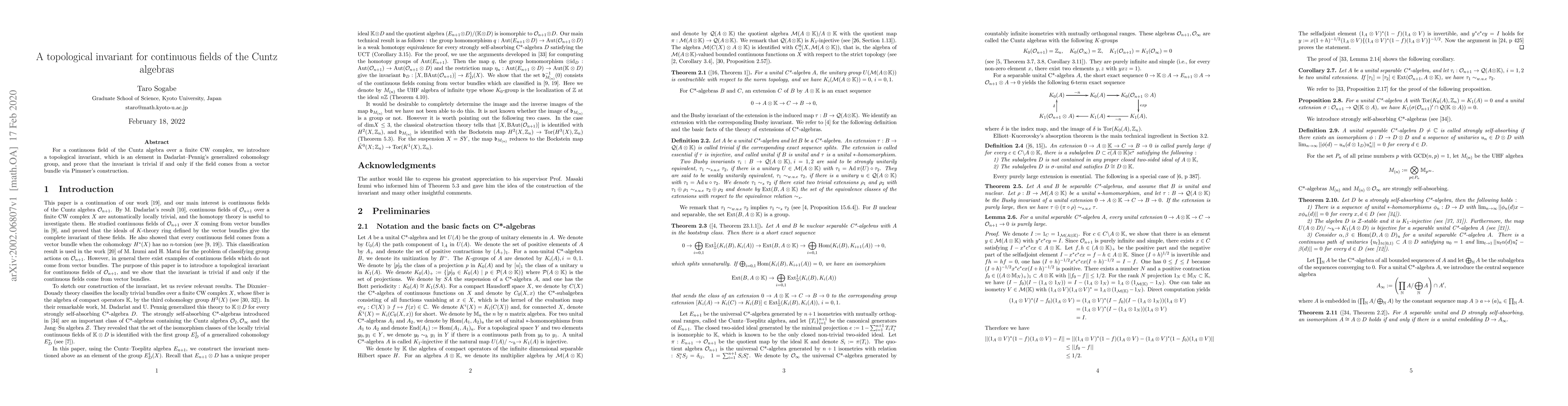 For a continuous field of the Cuntz algebra over a finite CW complex, we introduce a topological invariant, which is an element in Dadarlat-Pennig's generalized cohomology group, and prove that the invariant is trivial if and only if the field comes from a vector bundle via Pimsner's construction.