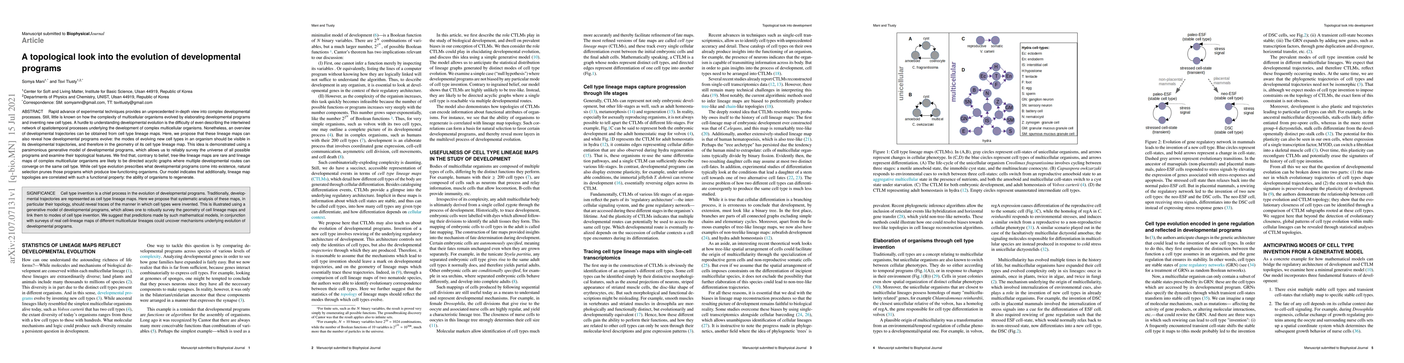 This paper explores how developmental programs evolve by examining the topology of cell type lineage maps. It finds that complex multicellular organisms typically have directed acyclic graphs in their lineage maps, indicating multiple developmental routes converging on the same cell type, and suggests that these topologies correlate with the organism's regenerative capabilities.