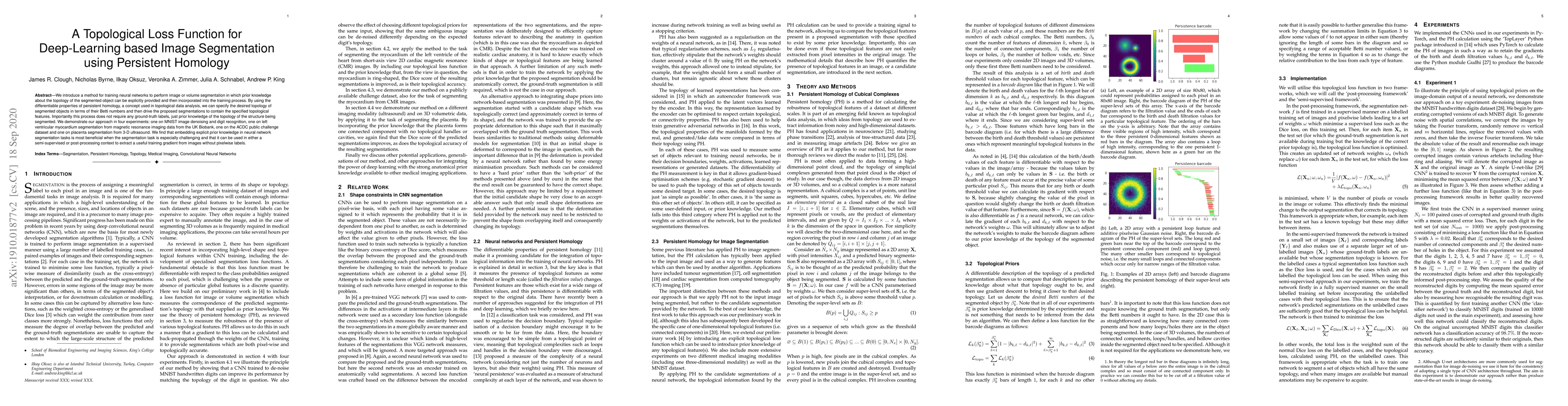 This paper proposes a novel method for deep-learning based image segmentation that incorporates topological prior knowledge through persistent homology, improving segmentation quality without requiring ground-truth labels. Experiments on MNIST digits, cardiac MRI, and placenta ultrasound data demonstrate significant enhancements in topological accuracy and segmentation performance.