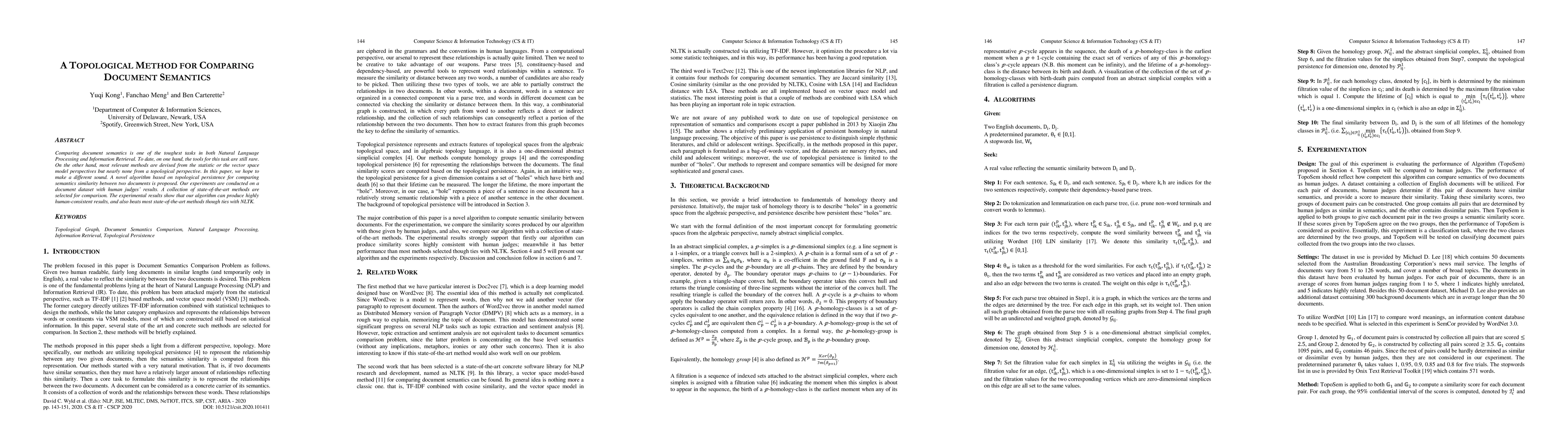 A novel algorithm using topological persistence compares document semantics similarity, producing highly human-consistent results that outperform state-of-the-art methods.