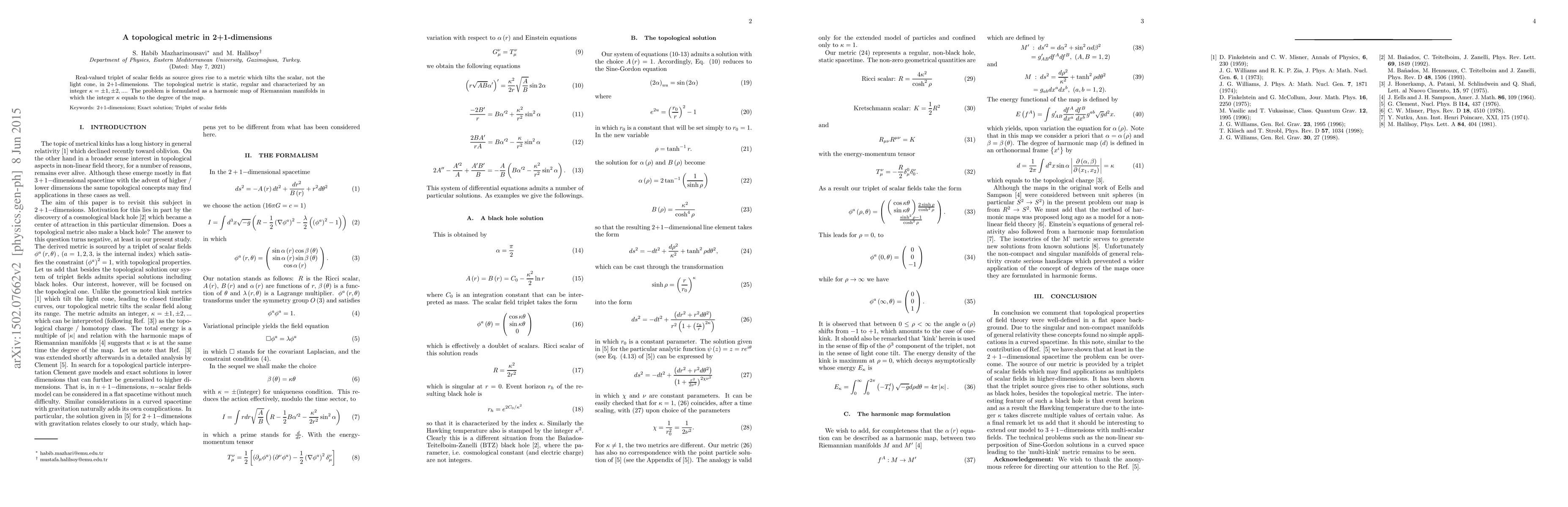 This paper introduces a topological metric in 2+1 dimensions derived from a triplet of scalar fields, which tilts the scalar rather than the light cone. The metric is static, regular, and characterized by an integer degree $\kappa =\pm 1,\pm 2,\ldots$.