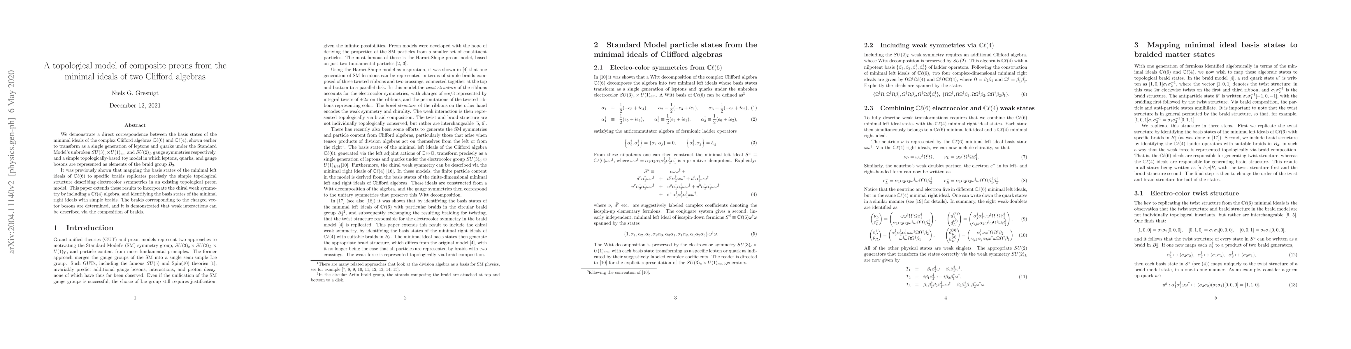 We demonstrate a direct correspondence between the basis states of the minimal ideals of the complex Clifford algebras $\mathbb{C}\ell(6)$ and $\mathbb{C}\ell(4)$, shown earlier to transform as a single generation of leptons and quarks under the Standard Model's unbroken $SU(3)_c\times U(1)_{em}$ and $SU(2)_L$ gauge symmetries respectively, and a simple topologically-based toy model in which leptons, quarks, and gauge bosons are represented as elements of the braid group $B_3$. It was previously shown that mapping the basis states of the minimal left ideals of $\mathbb{C}\ell(6)$ to specific braids replicates precisely the simple topological structure describing electrocolor symmetries in an existing topological preon model. This paper extends these results to incorporate the chiral weak symmetry by including a $\mathbb{C}\ell(4)$ algebra, and identifying the basis states of the minimal right ideals with simple braids. The braids corresponding to the charged vector bosons are determined, and it is demonstrated that weak interactions can be described via the composition of braids.