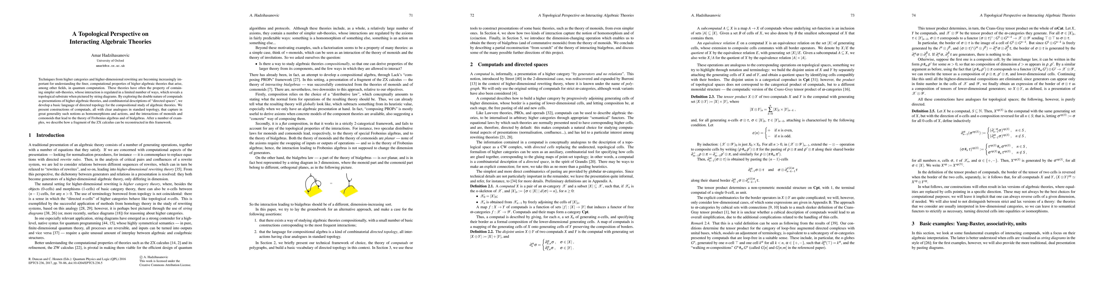 Techniques from higher categories and higher-dimensional rewriting are becoming increasingly important for understanding the finer, computational properties of higher algebraic theories that arise, among other fields, in quantum computation. These theories have often the property of containing simpler sub-theories, whose interaction is regulated in a limited number of ways, which reveals a topological substrate when pictured by string diagrams. By exploring the double nature of computads as presentations of higher algebraic theories, and combinatorial descriptions of "directed spaces", we develop a basic language of directed topology for the compositional study of algebraic theories. We present constructions of computads, all with clear analogues in standard topology, that capture in great generality such notions as homomorphisms and actions, and the interactions of monoids and comonoids that lead to the theory of Frobenius algebras and of bialgebras. After a number of examples, we describe how a fragment of the ZX calculus can be reconstructed in this framework.