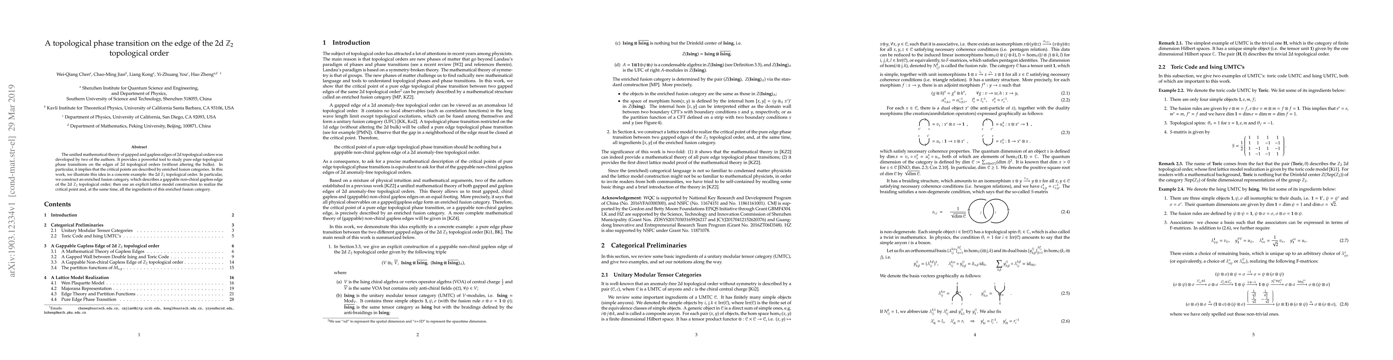 This paper develops a mathematical theory for studying topological phase transitions on the edges of 2d topological orders, particularly focusing on the 2d $\mathbb{Z}_2$ topological order. It constructs an enriched fusion category to describe a gapless edge and uses a lattice model to realize this critical transition.