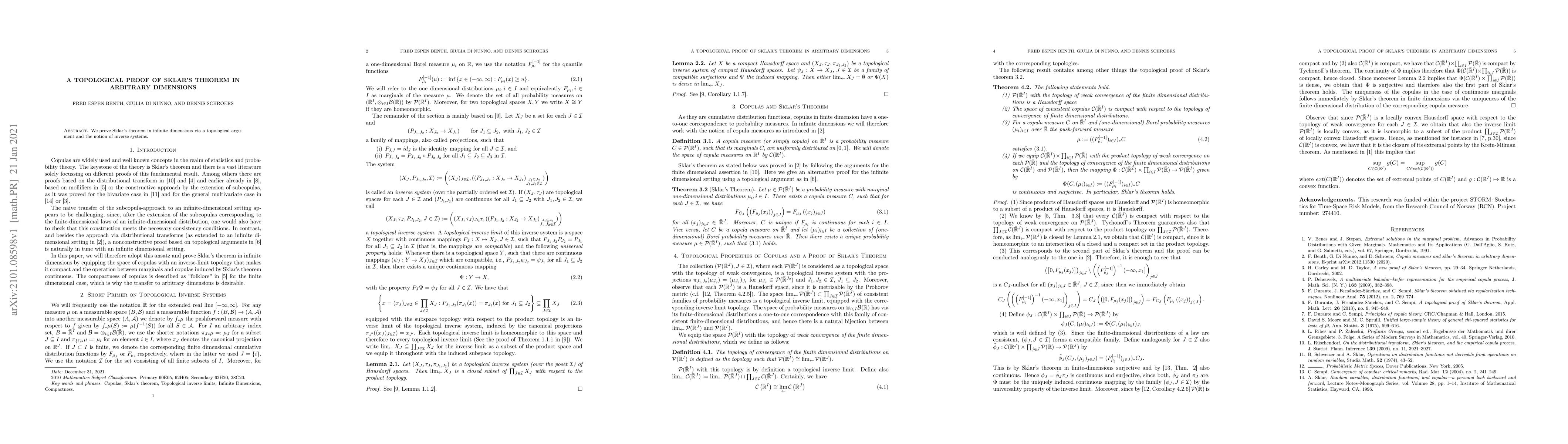 Summary: This paper presents a topological proof of Sklar's theorem in infinite dimensions using inverse systems, providing a new perspective on the relationship between multivariate distributions and their marginals. The method leverages topological arguments to establish the theorem in arbitrary dimensions.