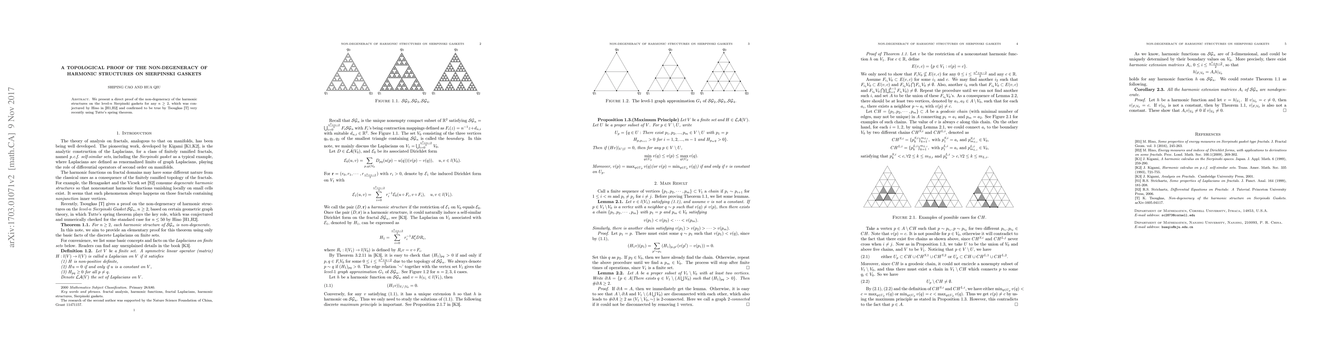 The paper introduces a novel topological proof for the non-degeneracy of harmonic structures on Sierpinski Gaskets, utilizing Laplacians, Dirichlet forms, and the maximum principle.