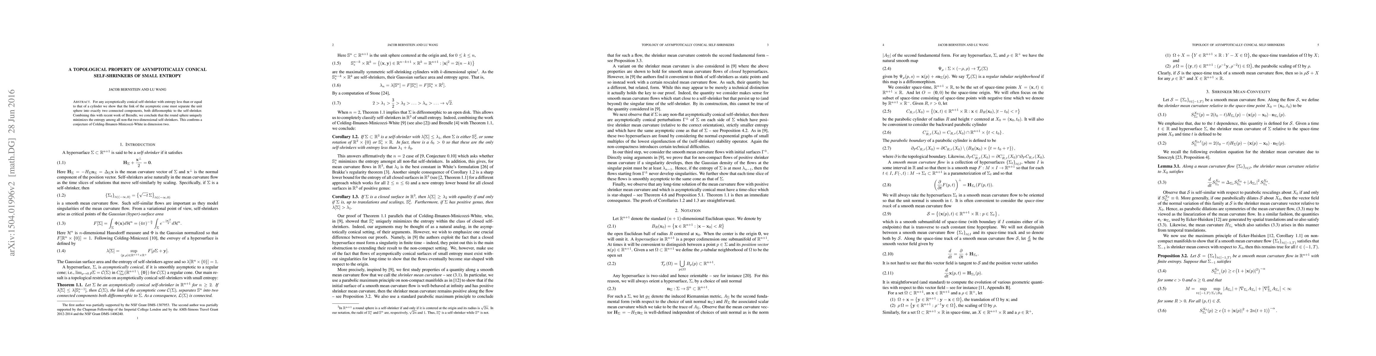 This paper proves that asymptotically conical self-shrinkers with small entropy must divide the unit sphere into two connected components, both diffeomorphic to the self-shrinker, confirming a conjecture about the round sphere's unique minimization of entropy among two-dimensional self-shrinkers.