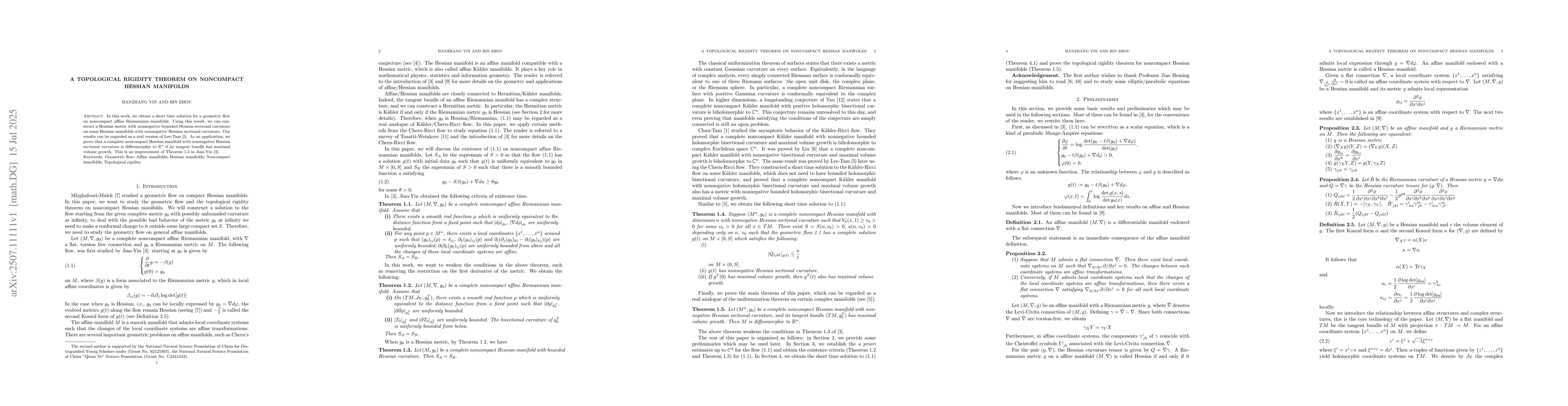 In this work, we obtain a short time solution for a geometric flow on noncompact affine Riemannian manifolds. Using this result, we can construct a Hessian metric with nonnegative bounded Hessian sectional curvature on some Hessian manifolds with nonnegative Hessian sectional curvature. Our results can be regarded as a real version of Lee-Tam \cite{LT20}. As an application, we prove that a complete noncompact Hessian manifold with nonnegative Hessian sectional curvature is diffeomorphic to $\mathbb{R}^n$ if its tangent bundle has maximal volume growth. This is an improvement of Theorem 1.3 in Jiao-Yin \cite{JY25}.
