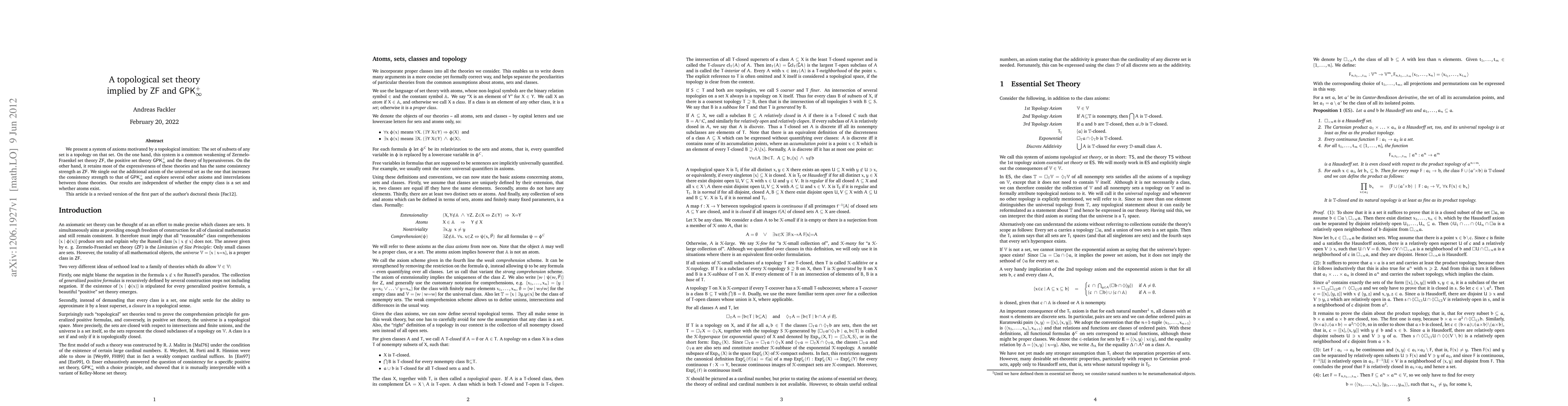 We present a system of axioms motivated by a topological intuition: The set of subsets of any set is a topology on that set. On the one hand, this system is a common weakening of Zermelo-Fraenkel set theory ZF, the positive set theory GPK and the theory of hyperuniverses. On the other hand, it retains most of the expressiveness of these theories and has the same consistency strength as ZF. We single out the additional axiom of the universal set as the one that increases the consistency strength to that of GPK and explore several other axioms and interrelations between those theories. Our results are independent of whether the empty class is a set and whether atoms exist. This article is a revised version of the first part of the author's doctoral thesis.