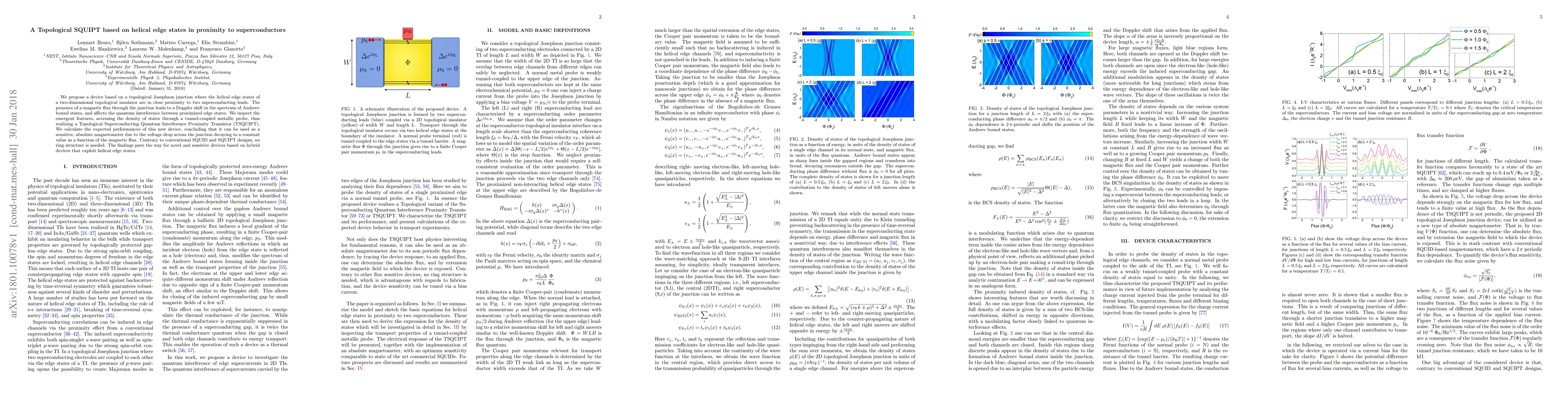 We propose a device based on a topological Josephson junction where the helical edge states of a two-dimensional topological insulator are in close proximity to two superconducting leads. The presence of a magnetic flux through the junction leads to a Doppler shift in the spectrum of Andreev bound states, and affects the quantum interference between proximized edge states. We inspect the emergent features, accessing the density of states through a tunnel-coupled metallic probe, thus realizing a Topological Superconducting Quantum Interference Proximity Transistor (TSQUIPT). We calculate the expected performances of this new device, concluding that it can be used as a sensitive, absolute magnetometer due to the voltage drop across the junction decaying to a constant value as a function of the magnetic flux. Contrary to conventional SQUID and SQUIPT designs, no ring structure is needed. The findings pave the way for novel and sensitive devices based on hybrid devices that exploit helical edge states.