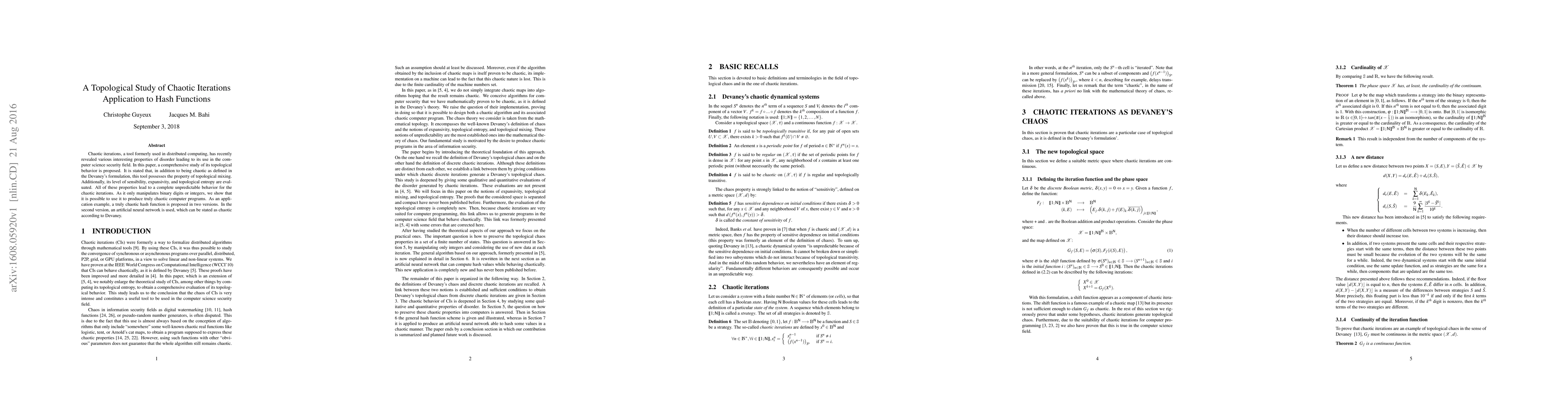 This paper investigates the topological properties of chaotic iterations, demonstrating their applicability in computer science security. The study shows that these iterations exhibit topological mixing, sensibility, expansivity, and high topological entropy, leading to unpredictable behavior suitable for creating chaotic hash functions, including a version utilizing an artificial neural network.