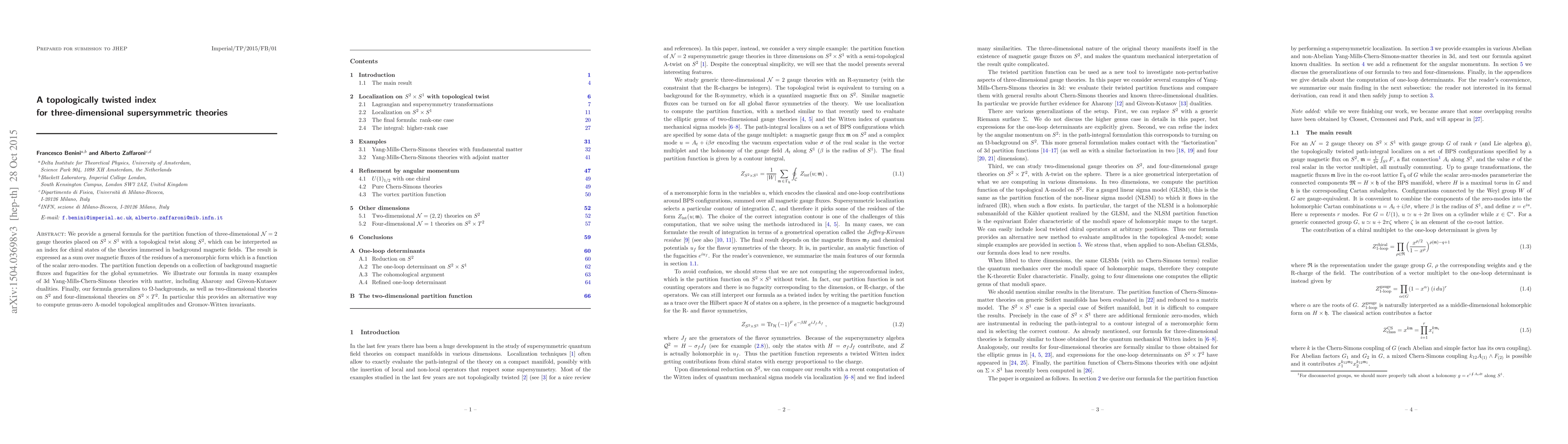 We provide a general formula for the partition function of three-dimensional $\mathcal{N}=2$ gauge theories placed on $S^2 \times S^1$ with a topological twist along $S^2$, which can be interpreted as an index for chiral states of the theories immersed in background magnetic fields. The result is expressed as a sum over magnetic fluxes of the residues of a meromorphic form which is a function of the scalar zero-modes. The partition function depends on a collection of background magnetic fluxes and fugacities for the global symmetries. We illustrate our formula in many examples of 3d Yang-Mills-Chern-Simons theories with matter, including Aharony and Giveon-Kutasov dualities. Finally, our formula generalizes to $\Omega$-backgrounds, as well as two-dimensional theories on $S^2$ and four-dimensional theories on $S^2 \times T^2$. In particular this provides an alternative way to compute genus-zero A-model topological amplitudes and Gromov-Witten invariants.