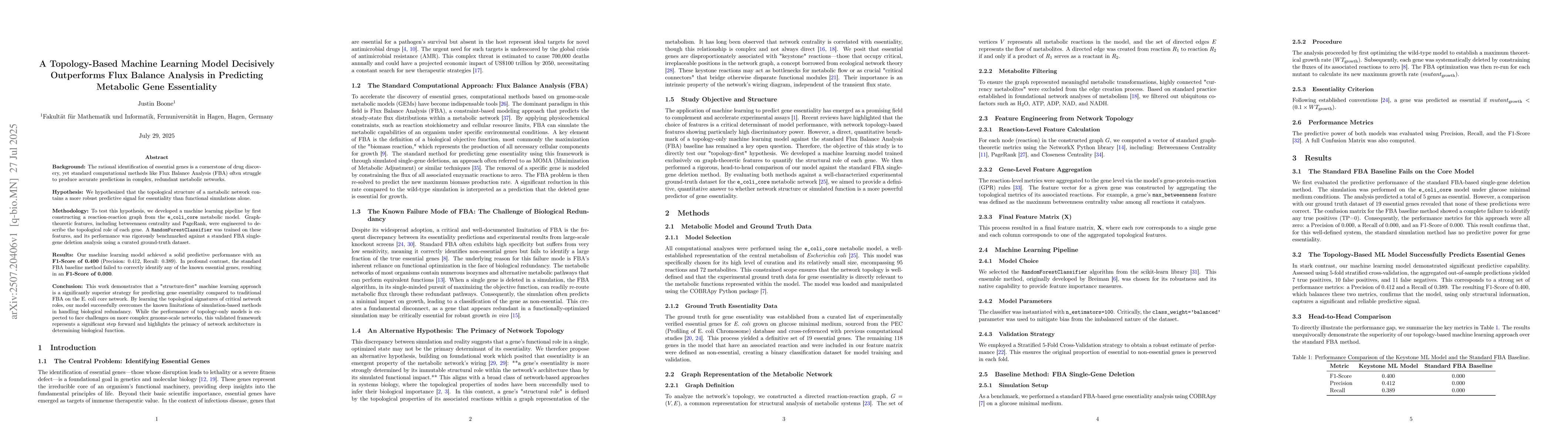 Background: The rational identification of essential genes is a cornerstone of drug discovery, yet standard computational methods like Flux Balance Analysis (FBA) often struggle to produce accurate predictions in complex, redundant metabolic networks. Hypothesis: We hypothesized that the topological structure of a metabolic network contains a more robust predictive signal for essentiality than functional simulations alone. Methodology: To test this hypothesis, we developed a machine learning pipeline by first constructing a reaction-reaction graph from the e_coli_core metabolic model. Graph-theoretic features, including betweenness centrality and PageRank, were engineered to describe the topological role of each gene. A RandomForestClassifier was trained on these features, and its performance was rigorously benchmarked against a standard FBA single-gene deletion analysis using a curated ground-truth dataset. Results: Our machine learning model achieved a solid predictive performance with an F1-Score of 0.400 (Precision: 0.412, Recall: 0.389). In profound contrast, the standard FBA baseline method failed to correctly identify any of the known essential genes, resulting in an F1-Score of 0.000. Conclusion: This work demonstrates that a "structure-first" machine learning approach is a significantly superior strategy for predicting gene essentiality compared to traditional FBA on the E. coli core network. By learning the topological signatures of critical network roles, our model successfully overcomes the known limitations of simulation-based methods in handling biological redundancy. While the performance of topology-only models is expected to face challenges on more complex genome-scale networks, this validated framework represents a significant step forward and highlights the primacy of network architecture in determining biological function.