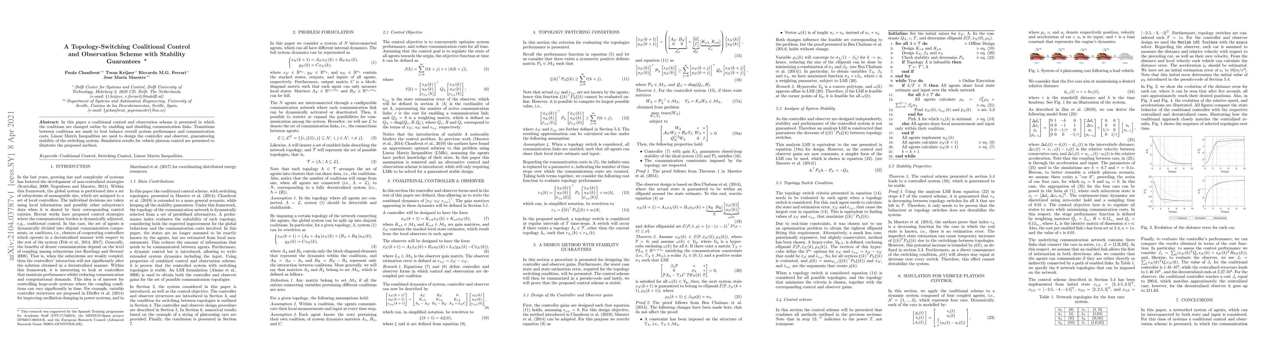 This paper proposes a topology-switching coalitional control and observation scheme that dynamically adjusts coalitions to optimize system performance and communication costs, using Linear Matrix Inequalities to ensure stability, and demonstrates its effectiveness through vehicle platoon control simulations.
