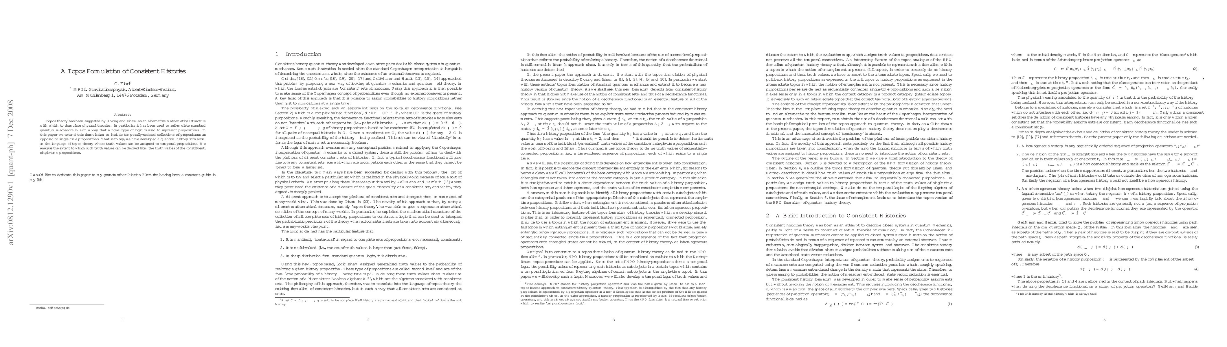 Topos theory has been suggested by Doring and Isham as an alternative mathematical structure with which to formulate physical theories. In particular it has been used to reformulate standard quantum mechanics in such a way that a novel type of logic is used to represent propositions. In this paper we extend this formulation to include temporally-ordered collections of propositions as opposed to single-time propositions. That is to say, we have developed a quantum history formalism in the language of topos theory where truth values can be assigned to temporal propositions. We analyse the extent to which such truth values can be derived from the truth values of the constituent, single-time propositions.