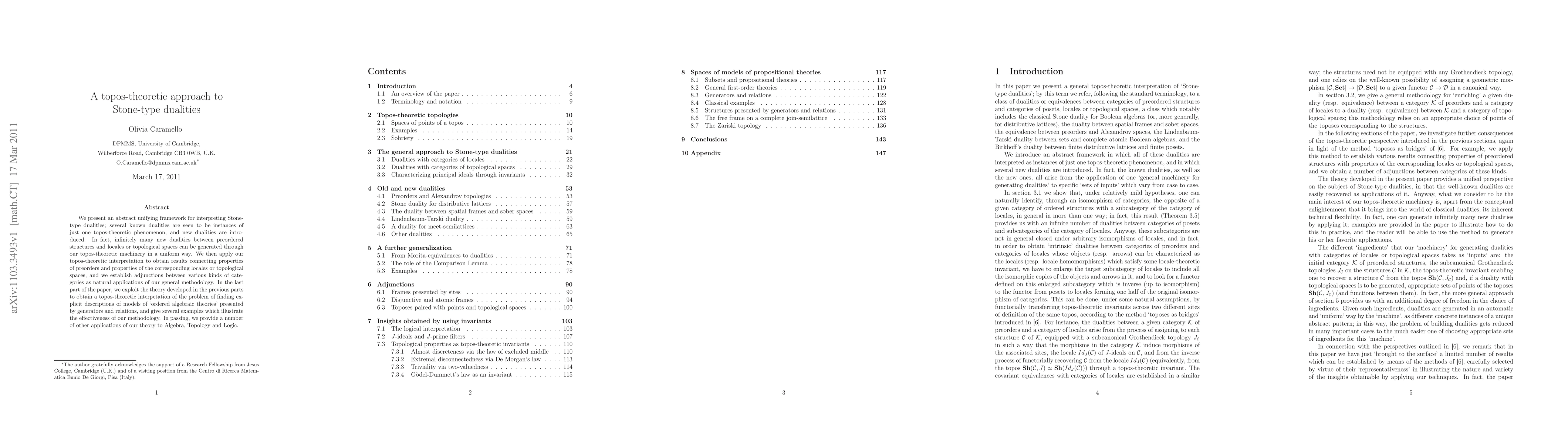 We present an abstract unifying framework for interpreting Stone-type dualities; several known dualities are seen to be instances of just one topos-theoretic phenomenon, and new dualities are introduced. In fact, infinitely many new dualities between preordered structures and locales or topological spaces can be generated through our topos-theoretic machinery in a uniform way. We then apply our topos-theoretic interpetation to obtain results connecting properties of preorders and properties of the corresponding locales or topological spaces, and we establish adjunctions between various kinds of categories as natural applications of our general methodology. In the last part of the paper, we exploit the theory developed in the previous parts to obtain a topos-theoretic interpretation of the problem of finding explicit descriptions of models of 'ordered algebraic theories' presented by generators and relations, and give several examples which illustrate the effectiveness of our methodology. In passing, we provide a number of other applications of our theory to Algebra, Topology and Logic.