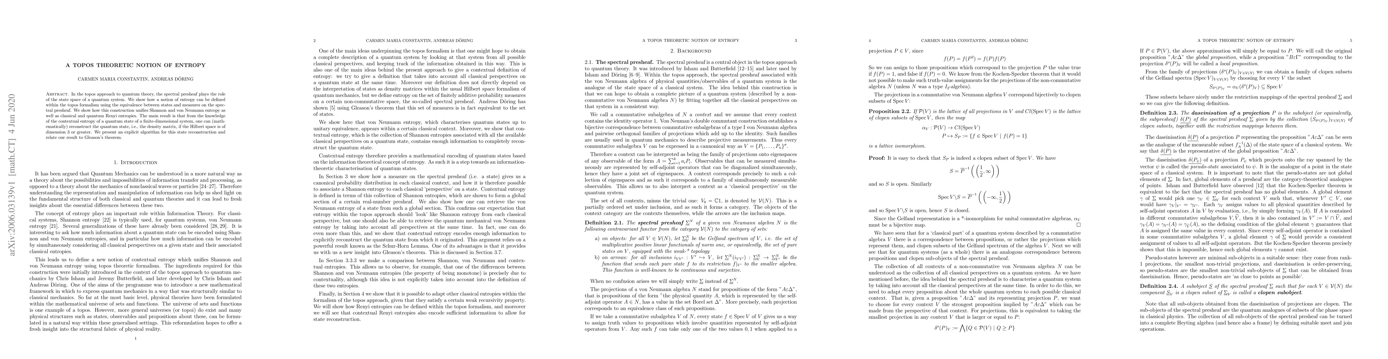 In the topos approach to quantum theory, the spectral presheaf plays the role of the state space of a quantum system. We show how a notion of entropy can be defined within the topos formalism using the equivalence between states and measures on the spectral presheaf. We show how this construction unifies Shannon and von Neumann entropy as well as classical and quantum Renyi entropies. The main result is that from the knowledge of the contextual entropy of a quantum state of a finite-dimensional system, one can (mathematically) reconstruct the quantum state, i.e., the density matrix, if the Hilbert space is of dimension $3$ or greater. We present an explicit algorithm for this state reconstruction and relate our result to Gleason's theorem.