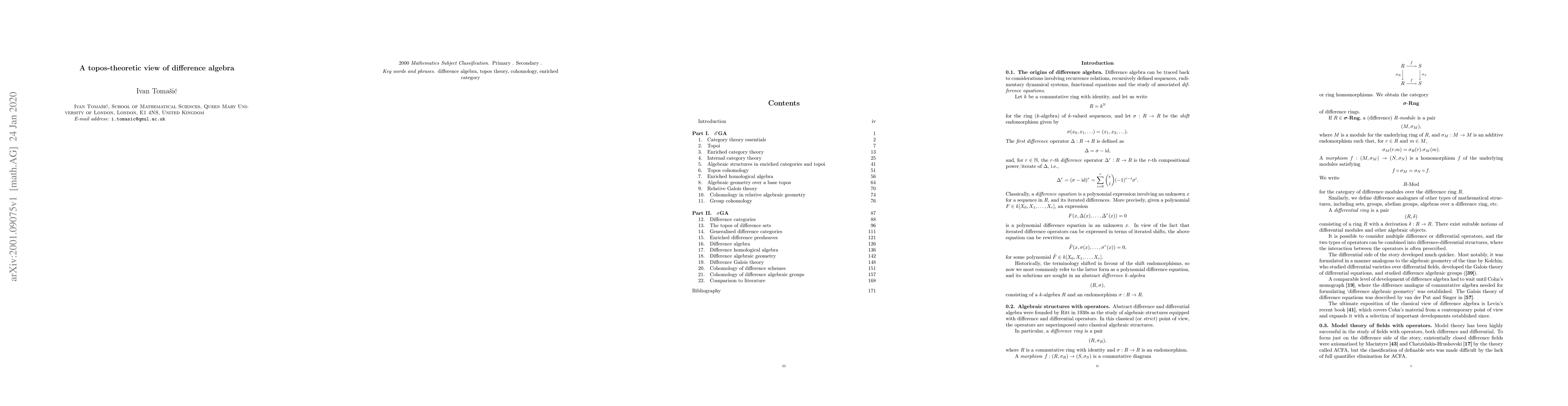 This paper explores difference algebra through the lens of topos theory, developing a difference homological algebra and establishing a robust foundation for difference algebraic geometry and cohomology theory of difference schemes.