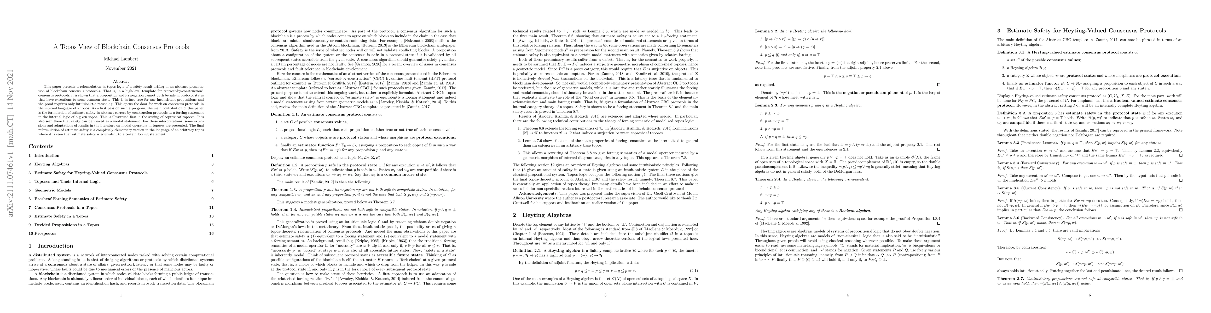 This paper presents a reformulation in topos logic of a safety result arising in an abstract presentation of blockchain consensus protocols. That is, in a high-level template for "correct-by-construction" consensus protocols, it is shown that a proposition and its negation cannot both be safe in protocol states that have executions to some common state. This is in fact true for any inconsistent propositions and the proof requires only intuitionistic reasoning. This opens the door for work on consensus protocols in the internal language of a topos. As a first pass on such a program, the main contribution of this paper is the formulation of estimate safety in abstract correct-by-construction protocols as a forcing statement in the internal logic of a given topos. This is illustrated first in the setting of copresheaf toposes. It is also seen there that safety can be viewed as a modal statement. For these interpretations, some extensions and adaptations of results in the literature on modal operators in toposes are presented. The final reformulation of estimate safety is a completely elementary version in the language of an arbitrary topos where it is seen that estimate safety is equivalent to a certain forcing statement.