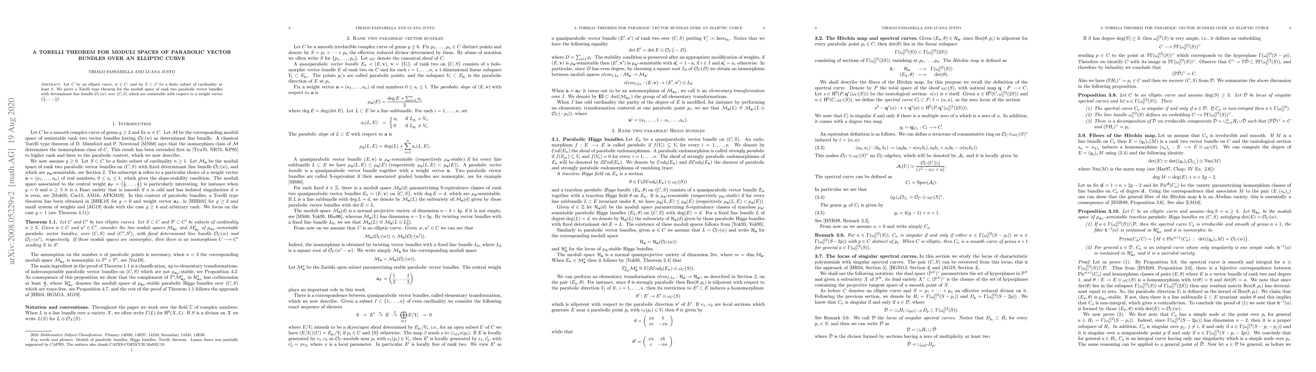 This paper proves a Torelli theorem for moduli spaces of rank two parabolic vector bundles over an elliptic curve $C$ with a specific determinant line bundle $\mathcal O_C(w)$, focusing on semistable bundles with respect to uniform weights. The result establishes a relationship between the moduli space and its associated invariants.