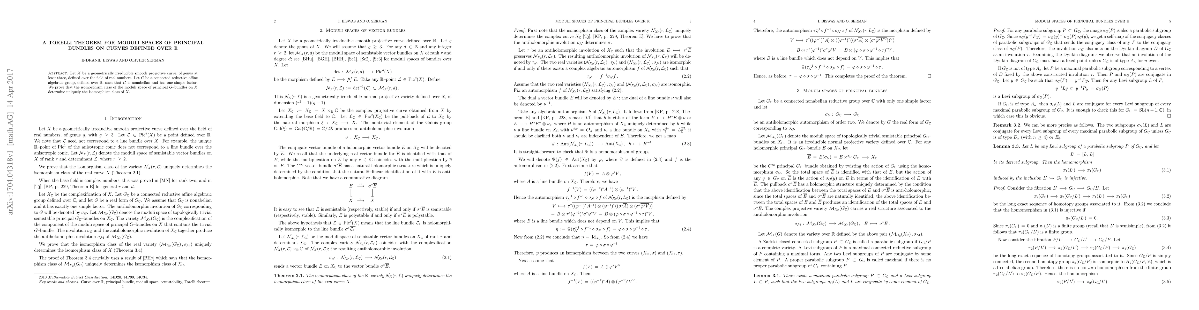 Let $X$ be a geometrically irreducible smooth projective curve, of genus at least three, defined over the field of real numbers. Let $G$ be a connected reductive affine algebraic group, defined over $\mathbb R$, such that $G$ is nonabelian and has one simple factor. We prove that the isomorphism class of the moduli space of principal $G$--bundles on $X$ determine uniquely the isomorphism class of $X$.