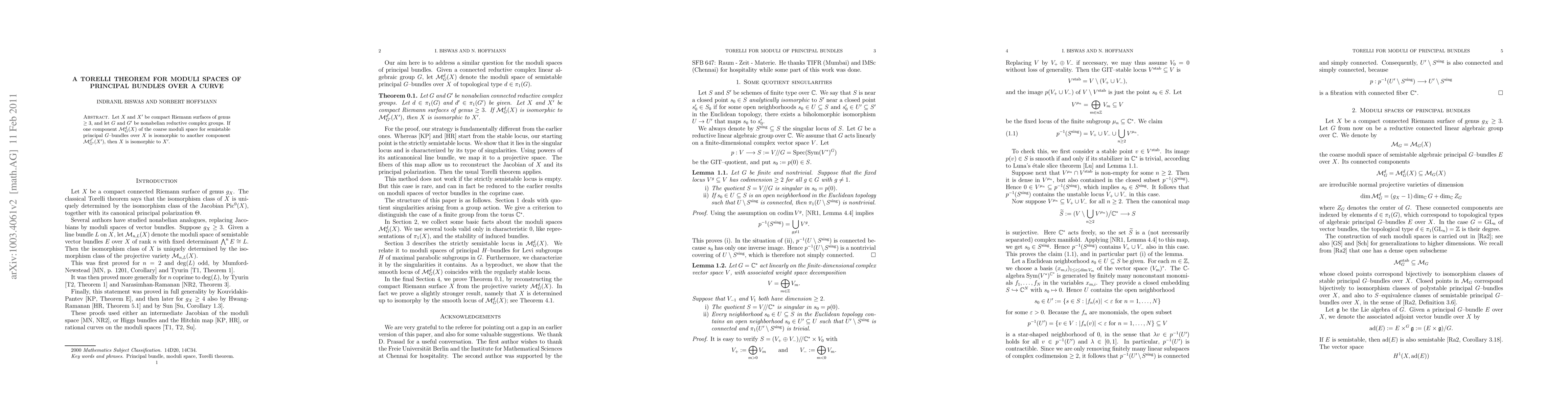Let X and X' be compact Riemann surfaces of genus at least 3, and let G and G' be nonabelian reductive complex groups. If one component M_G^d(X) of the moduli space for semistable principal G-bundles over X is isomorphic to another component M_{G'}^{d'}(X'), then X is isomorphic to X'.