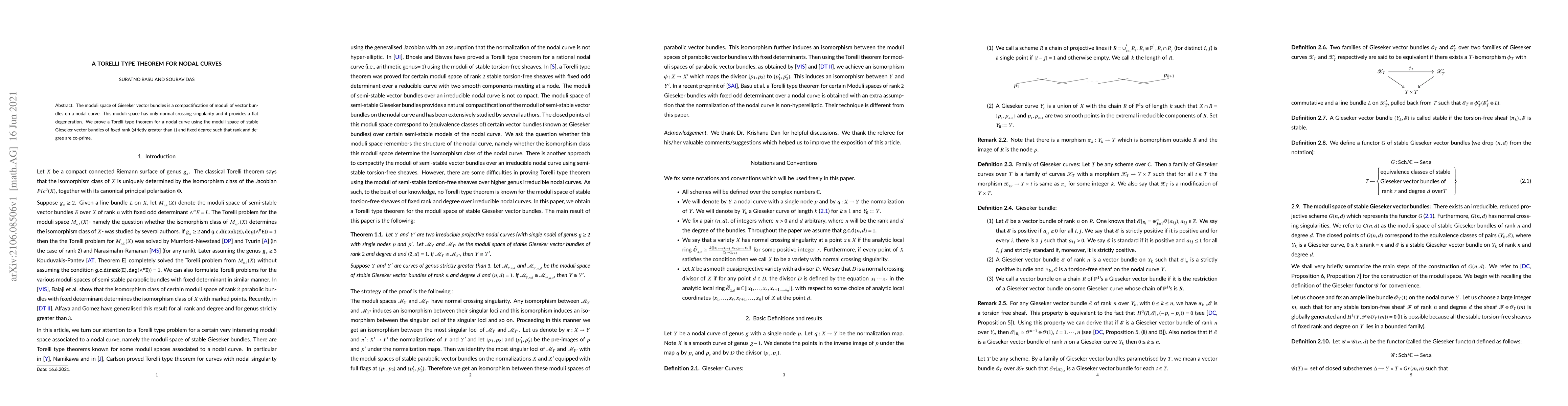 This paper proves a Torelli type theorem for nodal curves by utilizing the moduli space of Gieseker vector bundles, which compactifies vector bundles on nodal curves and provides a flat degeneration, ensuring only normal crossing singularities. The theorem is established for stable Gieseker vector bundles of fixed rank and degree, where rank and degree are co-prime.
