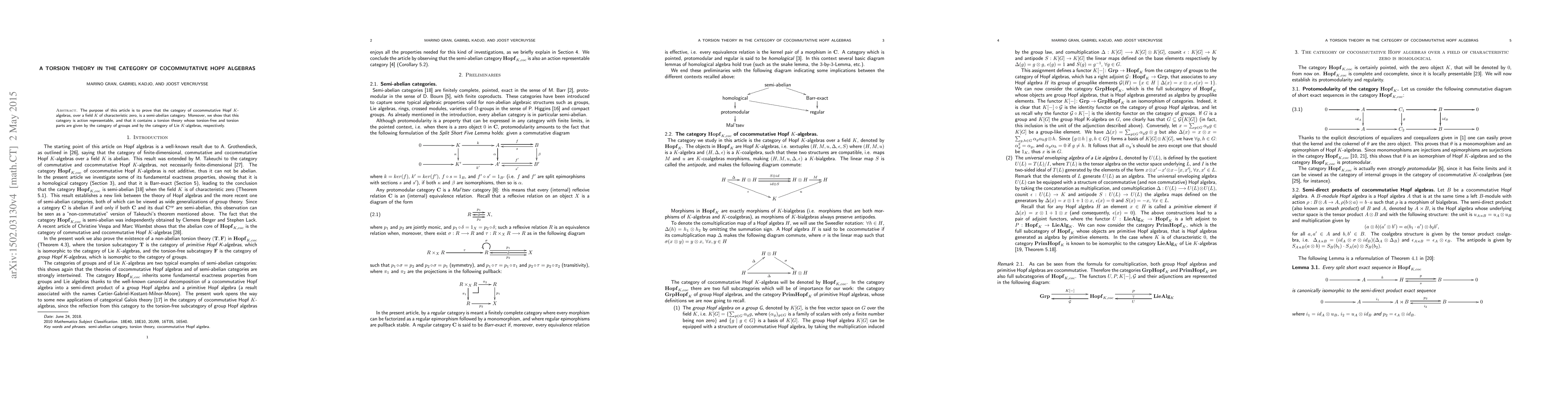 The purpose of this article is to prove that the category of cocommutative Hopf $K$-algebras, over a field $K$ of characteristic zero, is a semi-abelian category. Moreover, we show that this category is action representable, and that it contains a torsion theory whose torsion-free and torsion parts are given by the category of groups and by the category of Lie $K$-algebras, respectively.
