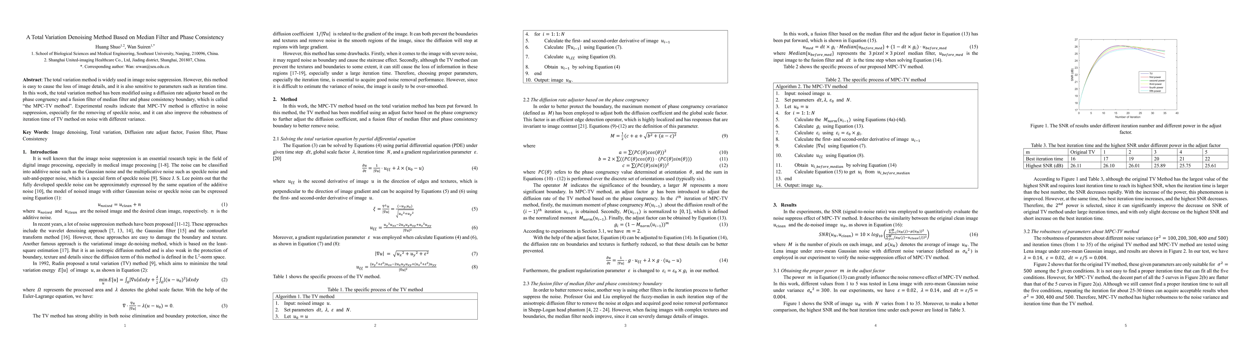 The total variation method is widely used in image noise suppression. However, this method is easy to cause the loss of image details, and it is also sensitive to parameters such as iteration time. In this work, the total variation method has been modified using a diffusion rate adjuster based on the phase congruency and a fusion filter of median filter and phase consistency boundary, which is called the MPC-TV method. Experimental results indicate that MPC-TV method is effective in noise suppression, especially for the removing of speckle noise, and it can also improve the robustness of iteration time of TV method on noise with different variance.