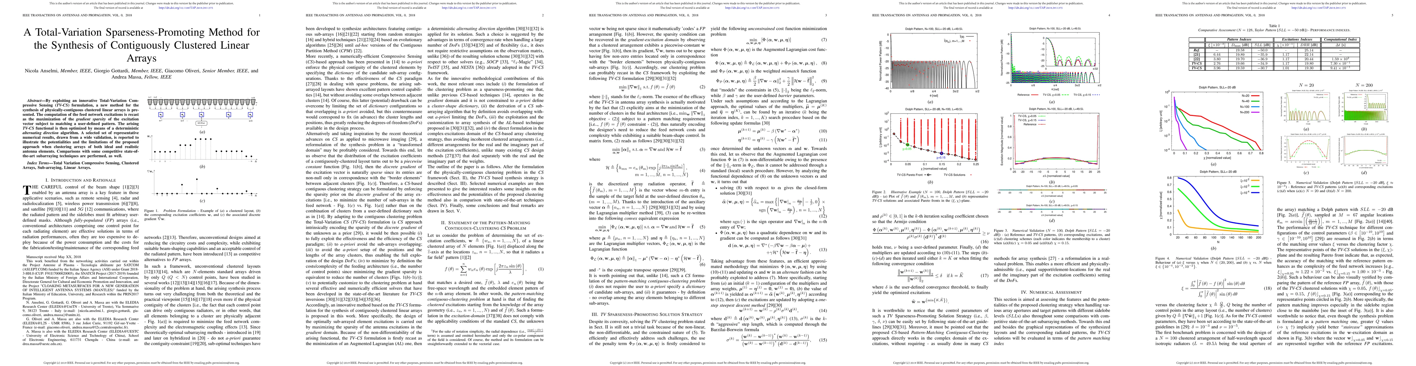 A new method for synthesizing contiguous clustered linear arrays uses a total-variation compressive sensing approach to optimize feed network excitations based on user-defined patterns, showcasing its potential for both ideal and realistic antenna elements.