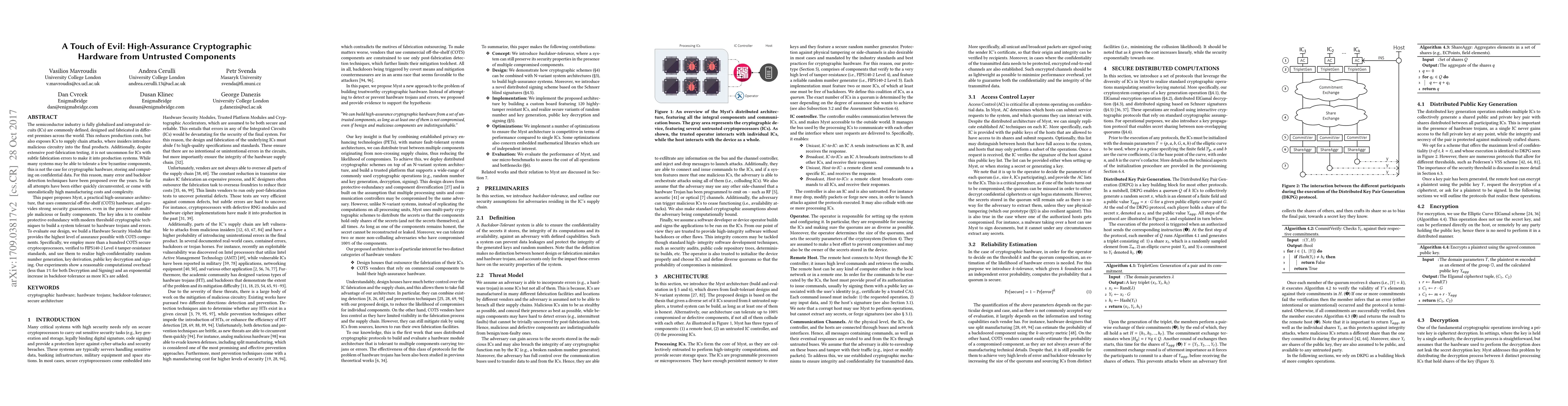 The semiconductor industry is fully globalized and integrated circuits (ICs) are commonly defined, designed and fabricated in different premises across the world. This reduces production costs, but also exposes ICs to supply chain attacks, where insiders introduce malicious circuitry into the final products. Additionally, despite extensive post-fabrication testing, it is not uncommon for ICs with subtle fabrication errors to make it into production systems. While many systems may be able to tolerate a few byzantine components, this is not the case for cryptographic hardware, storing and computing on confidential data. For this reason, many error and backdoor detection techniques have been proposed over the years. So far all attempts have been either quickly circumvented, or come with unrealistically high manufacturing costs and complexity. This paper proposes Myst, a practical high-assurance architecture, that uses commercial off-the-shelf (COTS) hardware, and provides strong security guarantees, even in the presence of multiple malicious or faulty components. The key idea is to combine protective-redundancy with modern threshold cryptographic techniques to build a system tolerant to hardware trojans and errors. To evaluate our design, we build a Hardware Security Module that provides the highest level of assurance possible with COTS components. Specifically, we employ more than a hundred COTS secure crypto-coprocessors, verified to FIPS140-2 Level 4 tamper-resistance standards, and use them to realize high-confidentiality random number generation, key derivation, public key decryption and signing. Our experiments show a reasonable computational overhead (less than 1% for both Decryption and Signing) and an exponential increase in backdoor-tolerance as more ICs are added.