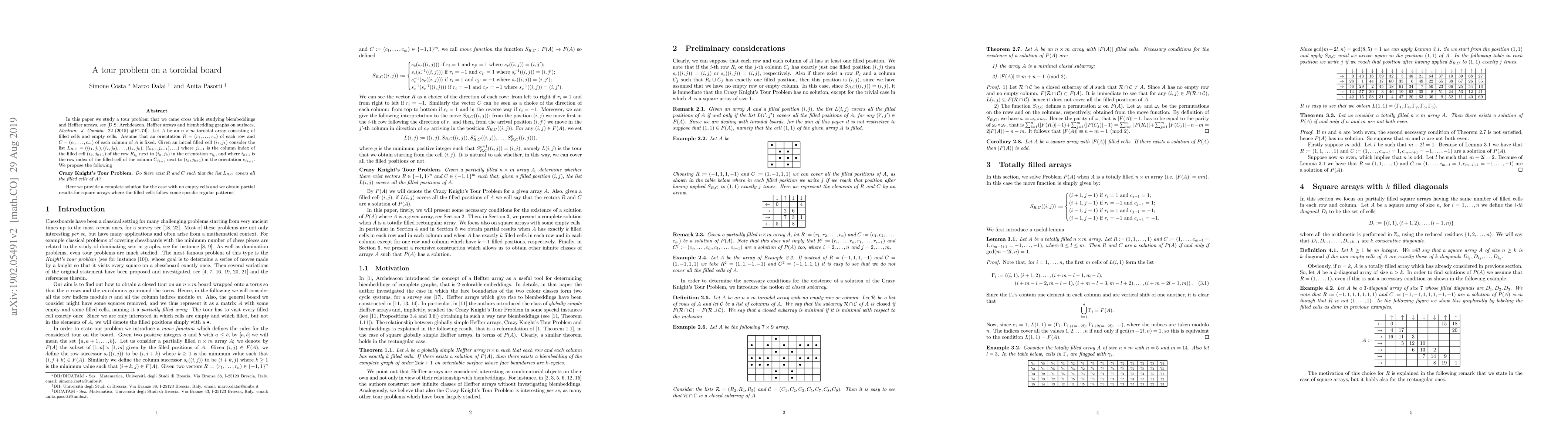This paper investigates a "Crazy Knight's Tour Problem" on a toroidal board, where the goal is to determine if it's possible to navigate through all filled cells of a toroidal array using a specific orientation of rows and columns. The authors provide a complete solution for arrays with no empty cells and partial results for square arrays with regular filled cell patterns.