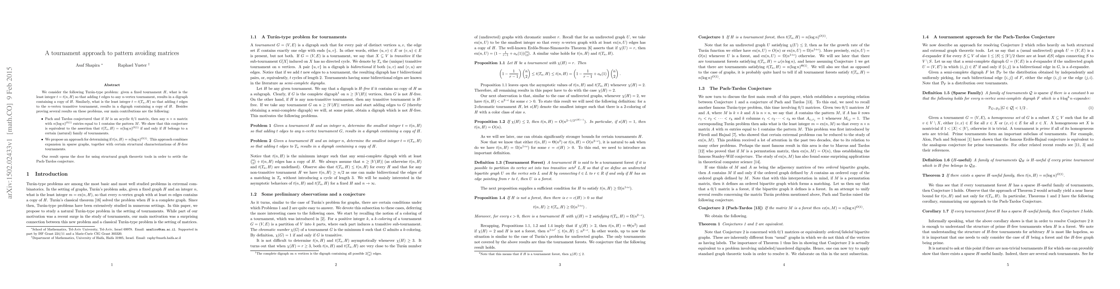 This paper explores a Turán-type problem in tournaments, determining the minimum number of edges needed to guarantee a subgraph isomorphic to a given tournament H. It establishes a link between the Pach-Tardos conjecture on pattern-avoiding matrices and this tournament problem. The research proposes a method using sparse graph expansion and structural characterizations of H-free tournaments to address the conjecture, thereby bridging matrix theory and tournament structure.