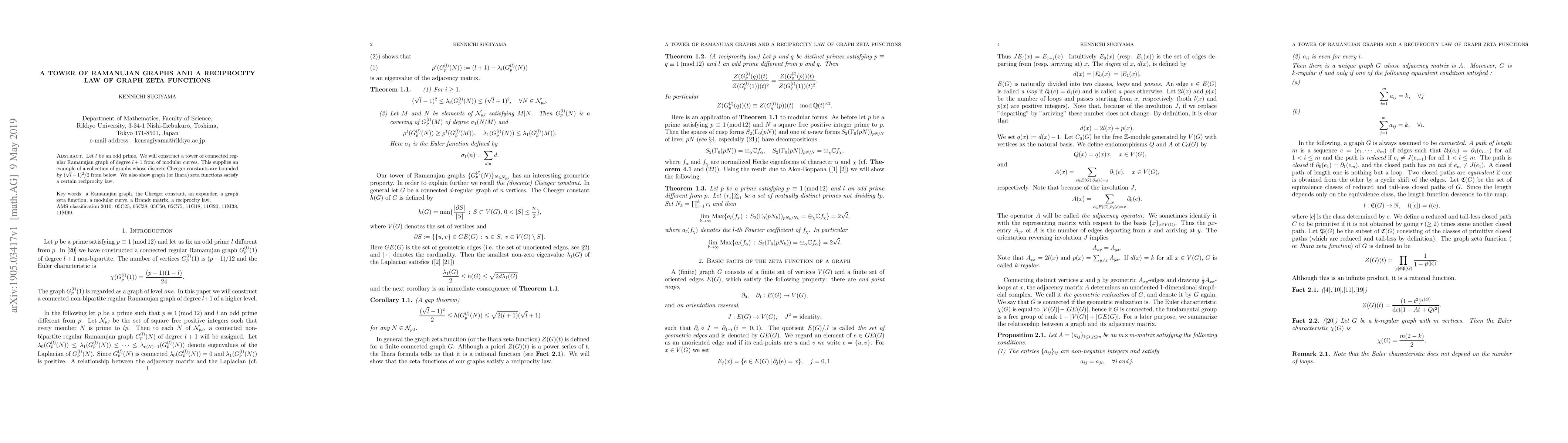 Researchers constructed a tower of regular Ramanujan graphs with modular curves, proving that their discrete Cheeger constants are bounded below by ⊉(sqrt{l}-1)^2/2, and showing a reciprocity law for graph zeta functions.