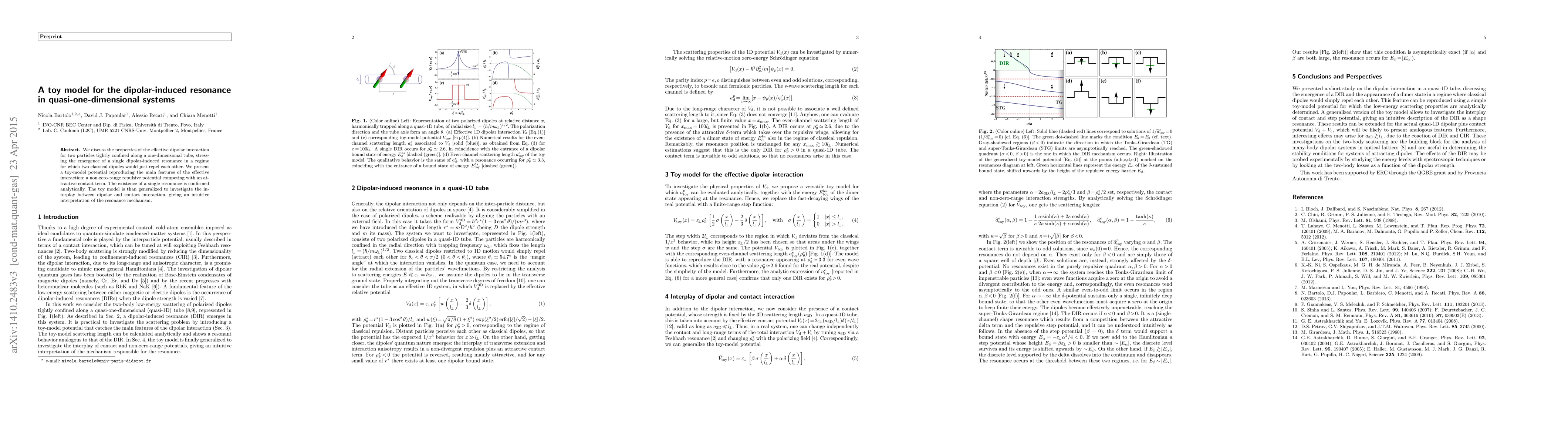 We discuss the properties of the effective dipolar interaction for two particles tightly confined along a one-dimensional tube, stressing the emergence of a single dipolar-induced resonance in a regime for which two classical dipoles would just repel each other. We present a toy-model potential reproducing the main features of the effective interaction: a non-zero-range repulsive potential competing with an attractive contact term. The existence of a single resonance is confirmed analytically. The toy model is than generalized to investigate the interplay between dipolar and contact interaction, giving an intuitive interpretation of the resonance mechanism.