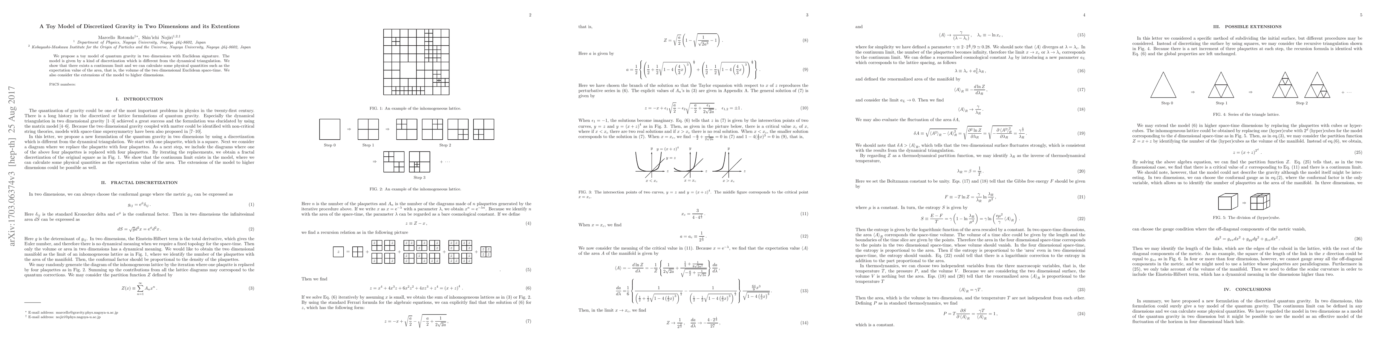 We propose a toy model of quantum gravity in two dimensions with Euclidean signature. The model is given by a kind of discretization which is different from the dynamical triangulation. We show that there exists a continuum limit and we can calculate some physical quantities such as the expectation value of the area, that is, the volume of the two dimensional euclidean space-time. We also consider the extensions of the model to higher dimensions.