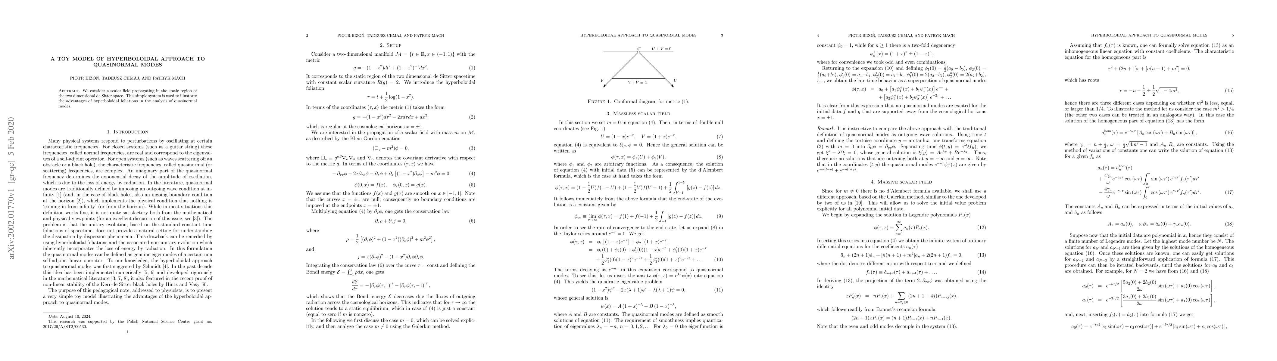 Summary: This paper explores a scalar field in a two-dimensional de Sitter space to demonstrate the benefits of hyperboloidal foliations in analyzing quasinormal modes, providing a toy model for more complex systems.