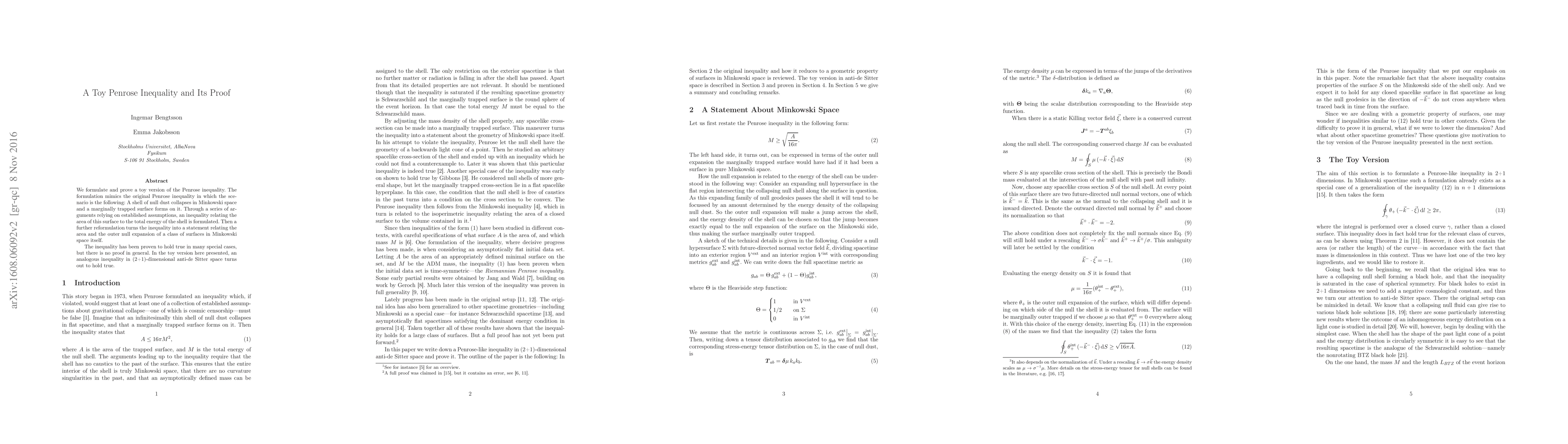 We formulate and prove a toy version of the Penrose inequality. The formulation mimics the original Penrose inequality in which the scenario is the following: A shell of null dust collapses in Minkowski space and a marginally trapped surface forms on it. Through a series of arguments relying on established assumptions, an inequality relating the area of this surface to the total energy of the shell is formulated. Then a further reformulation turns the inequality into a statement relating the area and the outer null expansion of a class of surfaces in Minkowski space itself. The inequality has been proven to hold true in many special cases, but there is no proof in general. In the toy version here presented, an analogous inequality in (2+1)-dimensional anti-de Sitter space turns out to hold true.