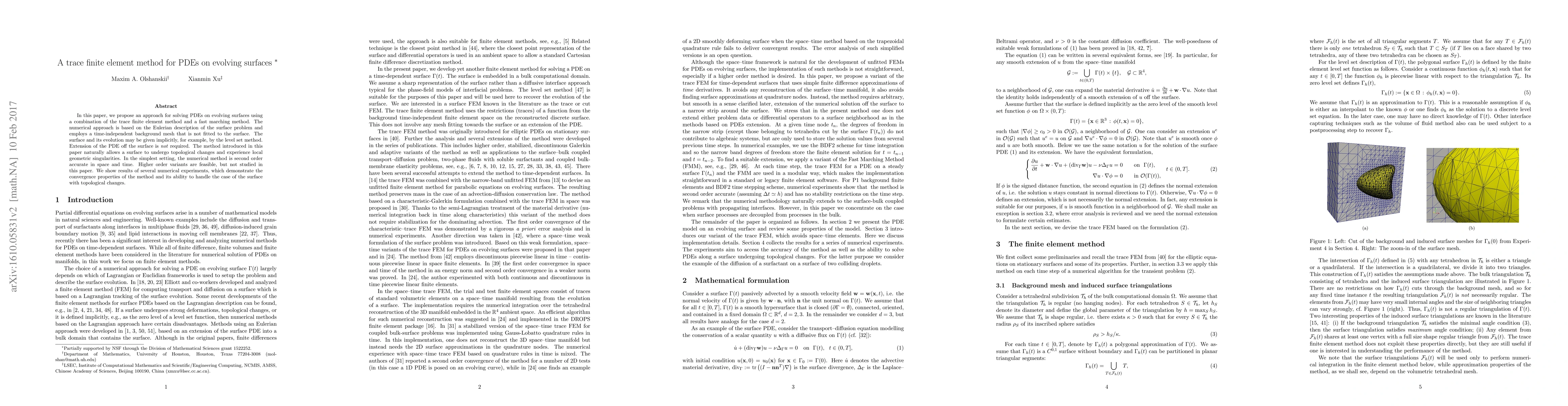 The paper proposes a trace finite element method for solving PDEs on evolving surfaces, utilizing a combination with a fast marching method. The method employs an Eulerian description of the surface problem with a time-independent background mesh, not fitted to the surface. It can handle topological changes and geometric singularities.