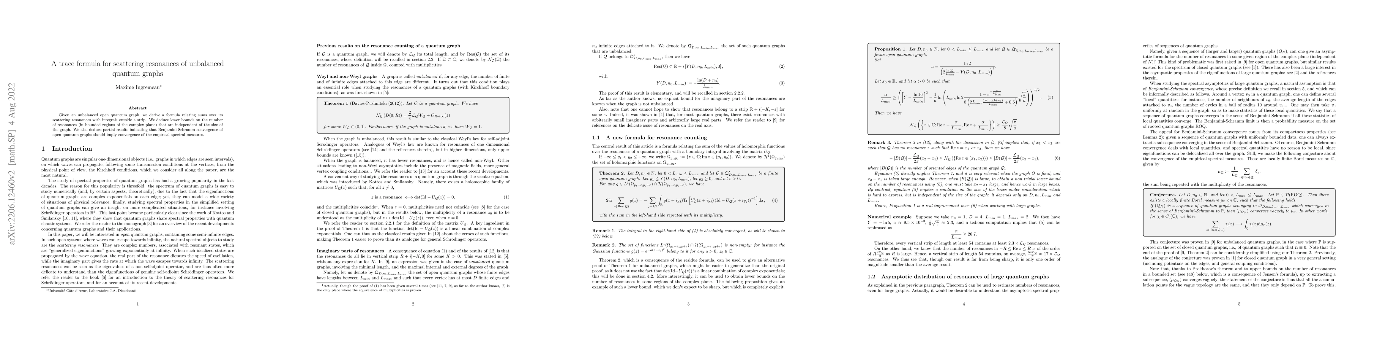 This paper derives a trace formula linking scattering resonances of unbalanced quantum graphs to integrals outside a strip, establishing lower bounds on the number of resonances independent of graph size. It also suggests that Benjamini-Schramm convergence of these graphs implies convergence of their empirical spectral measures.