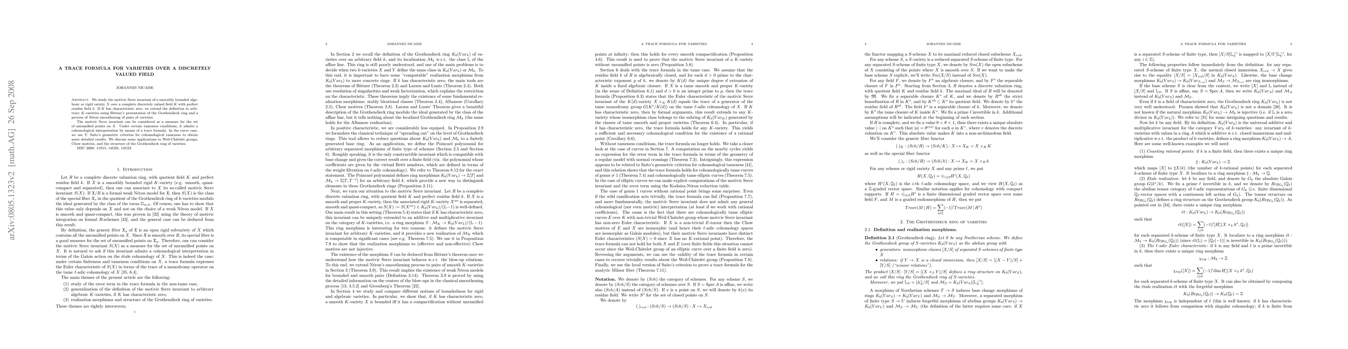 This paper develops a trace formula for the motivic Serre invariant of varieties over a complete discretely valued field, extending its definition to all varieties under certain conditions. It provides a cohomological interpretation under tameness, with applications to Weil-Châtelet groups, Chow motives, and the structure of the Grothendieck ring.