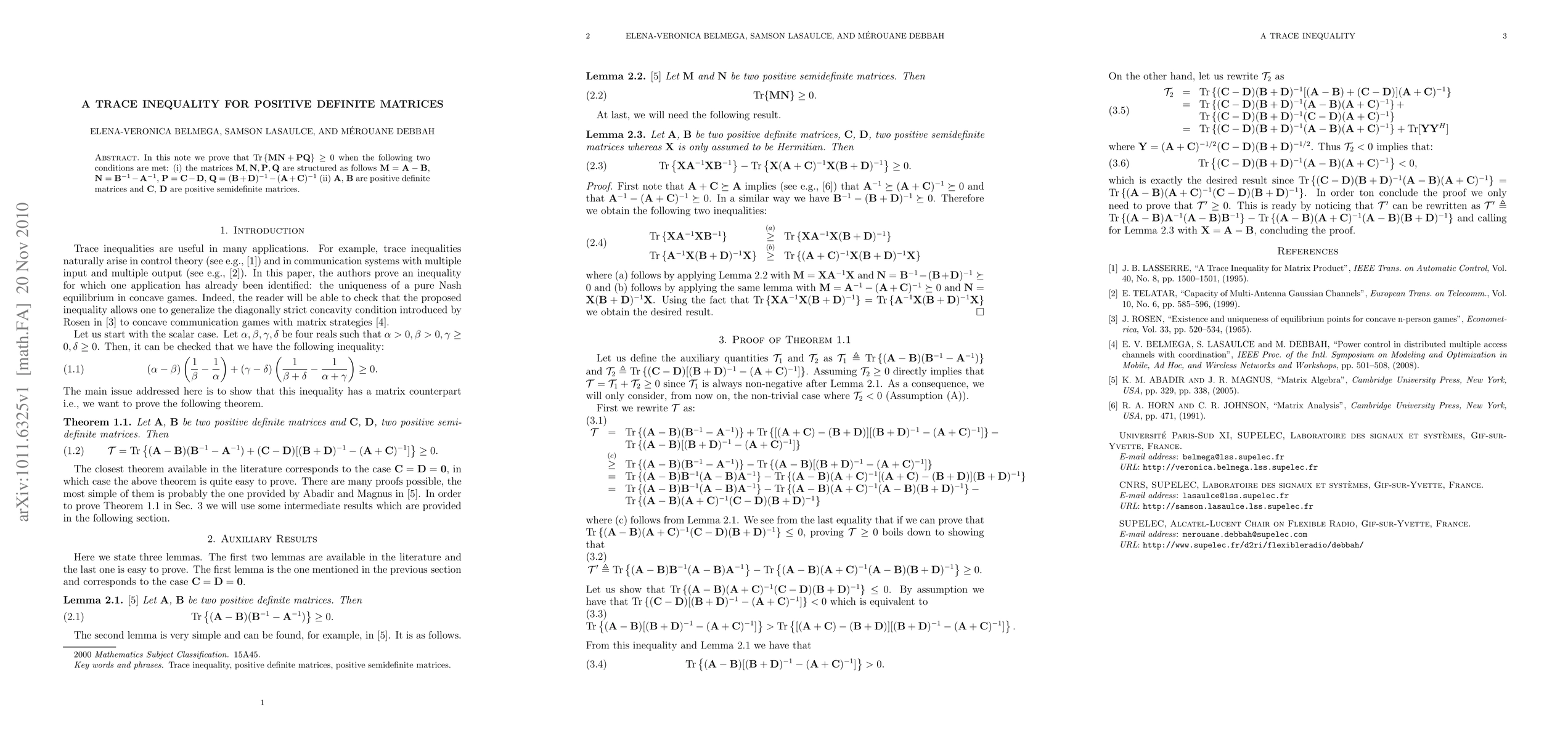 Researchers prove a trace inequality for positive definite matrices under specific conditions, ensuring a lower bound of 0 for the expression Tr(MN+ PQ).
