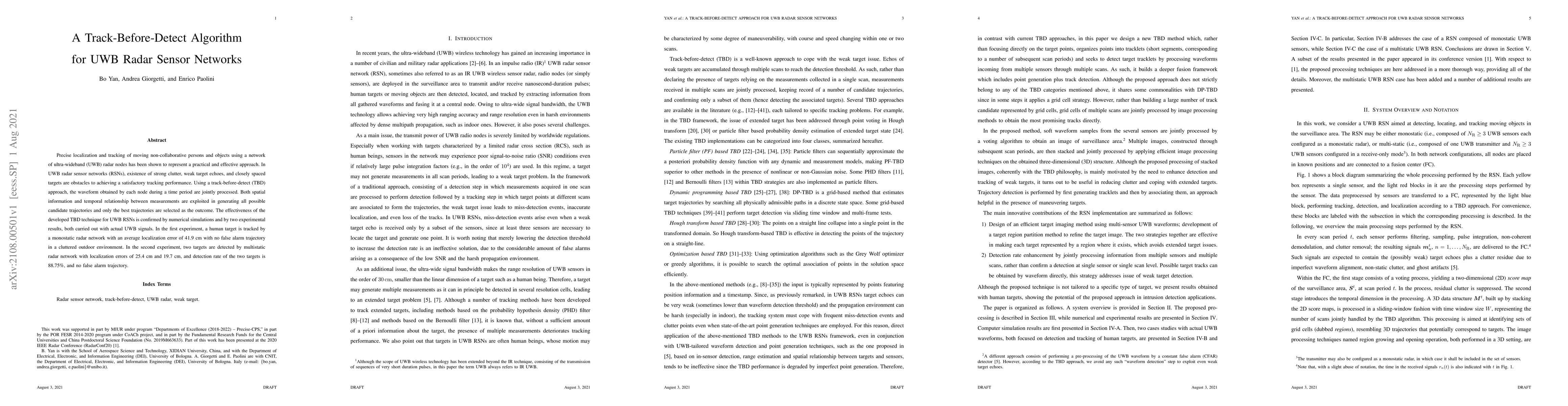 This paper proposes a track-before-detect (TBD) algorithm for ultra-wideband (UWB) radar sensor networks to precisely localize and track non-collaborative moving persons and objects. The TBD method processes waveforms from multiple nodes to generate and select the best trajectories, confirmed effective by simulations and experiments with actual UWB signals.