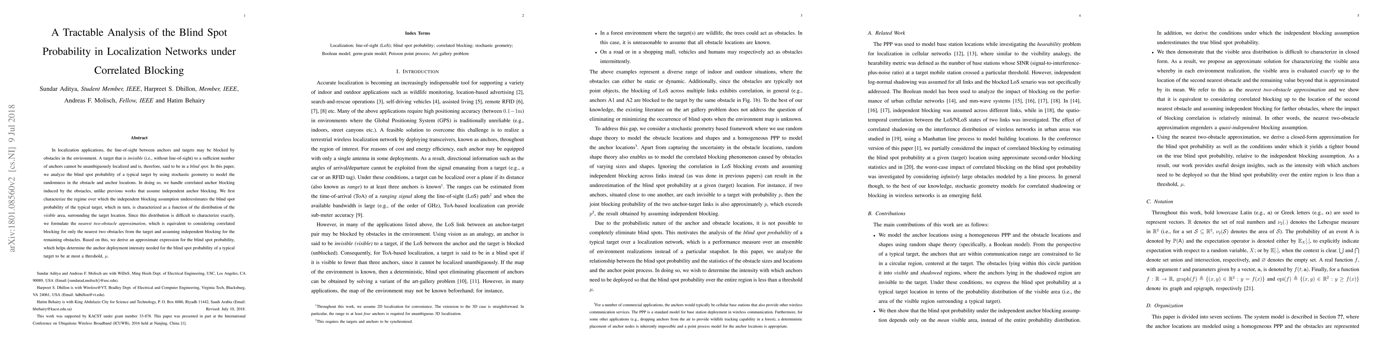 In localization applications, the line-of-sight between anchors and targets may be blocked by obstacles in the environment. A target that is invisible (i.e., without line-of-sight) to a sufficient number of anchors cannot be unambiguously localized and is, therefore, said to be in a blind spot. In this paper, we analyze the blind spot probability of a typical target by using stochastic geometry to model the randomness in the obstacle and anchor locations. In doing so, we handle correlated anchor blocking induced by the obstacles, unlike previous works that assume independent anchor blocking. We first characterize the regime over which the independent blocking assumption underestimates the blind spot probability of the typical target, which in turn, is characterized as a function of the distribution of the visible area, surrounding the target location. Since this distribution is difficult to characterize exactly, we formulate the nearest two-obstacle approximation, which is equivalent to considering correlated blocking for only the nearest two obstacles from the target and assuming independent blocking for the remaining obstacles. Based on this, we derive an approximate expression for the blind spot probability, which helps determine the anchor deployment intensity needed for the blind spot probability of a typical target to be at most a threshold, $\mu$.