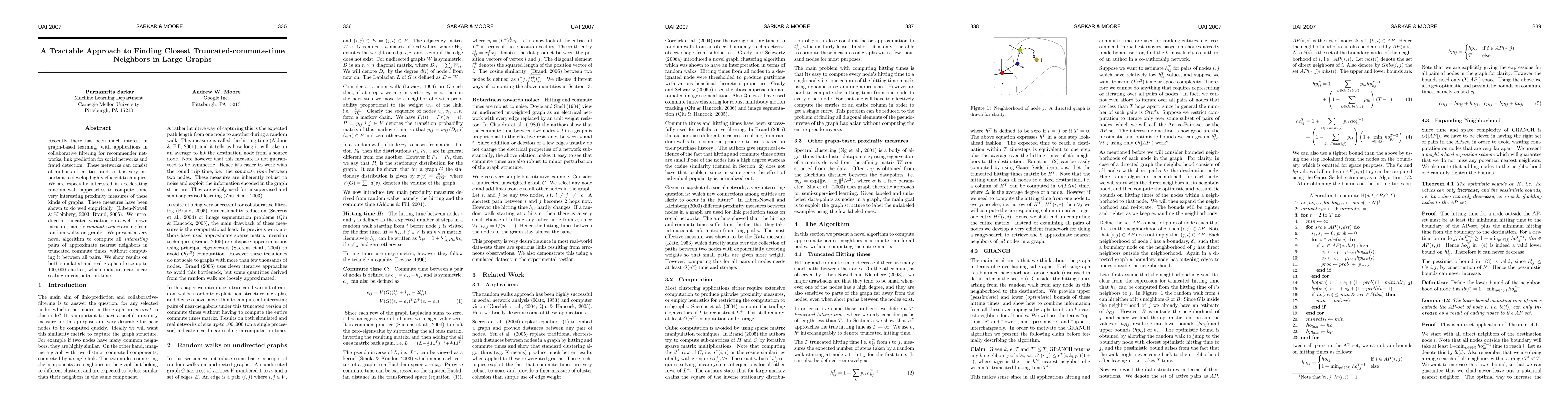 Recently there has been much interest in graph-based learning, with applications in collaborative filtering for recommender networks, link prediction for social networks and fraud detection. These networks can consist of millions of entities, and so it is very important to develop highly efficient techniques. We are especially interested in accelerating random walk approaches to compute some very interesting proximity measures of these kinds of graphs. These measures have been shown to do well empirically (Liben-Nowell & Kleinberg, 2003; Brand, 2005). We introduce a truncated variation on a well-known measure, namely commute times arising from random walks on graphs. We present a very novel algorithm to compute all interesting pairs of approximate nearest neighbors in truncated commute times, without computing it between all pairs. We show results on both simulated and real graphs of size up to 100; 000 entities, which indicate near-linear scaling in computation time.