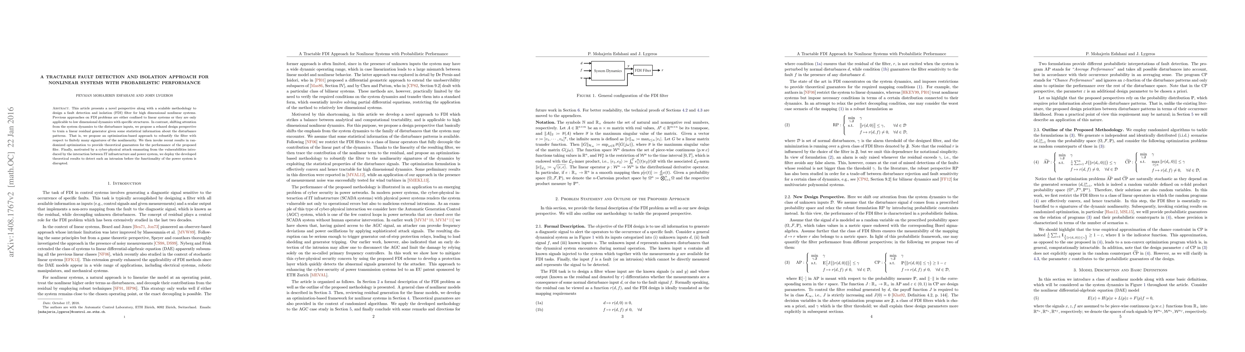This article presents a novel perspective along with a scalable methodology to design a fault detection and isolation (FDI) filter for high dimensional nonlinear systems. Previous approaches on FDI problems are either confined to linear systems or they are only applicable to low dimensional dynamics with specific structures. In contrast, shifting attention from the system dynamics to the disturbance inputs, we propose a relaxed design perspective to train a linear residual generator given some statistical information about the disturbance patterns. That is, we propose an optimization-based approach to robustify the filter with respect to finitely many signatures of the nonlinearity. We then invoke recent results in randomized optimization to provide theoretical guarantees for the performance of the proposed filer. Finally, motivated by a cyber-physical attack emanating from the vulnerabilities introduced by the interaction between IT infrastructure and power system, we deploy the developed theoretical results to detect such an intrusion before the functionality of the power system is disrupted.
