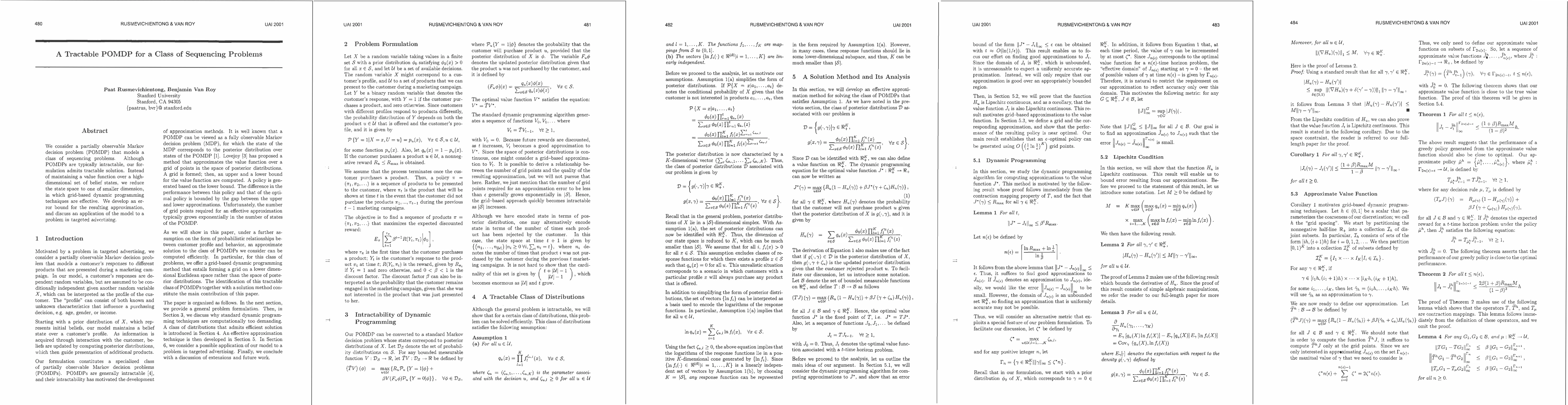 We consider a partially observable Markov decision problem (POMDP) that models a class of sequencing problems. Although POMDPs are typically intractable, our formulation admits tractable solution. Instead of maintaining a value function over a high-dimensional set of belief states, we reduce the state space to one of smaller dimension, in which grid-based dynamic programming techniques are effective. We develop an error bound for the resulting approximation, and discuss an application of the model to a problem in targeted advertising.